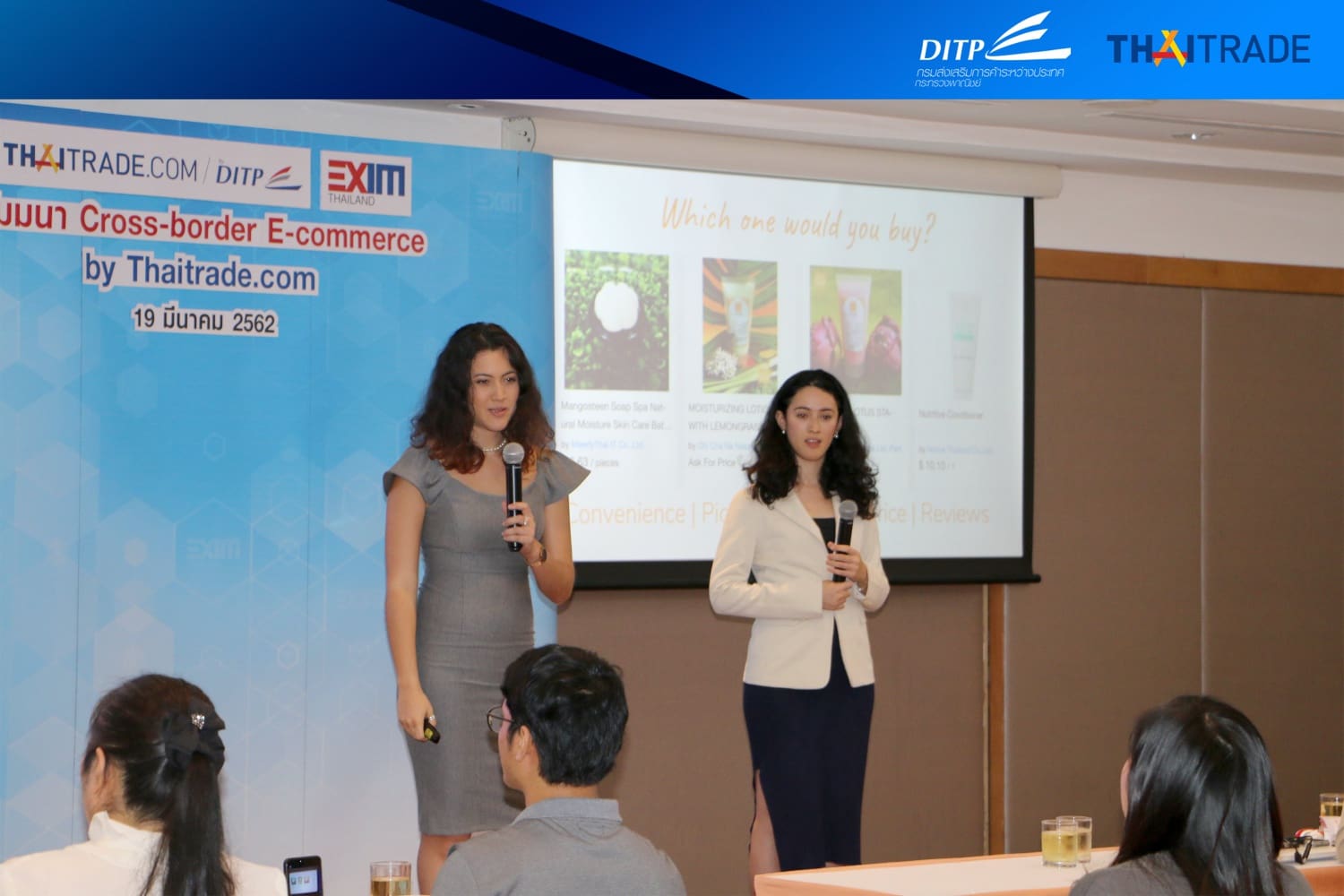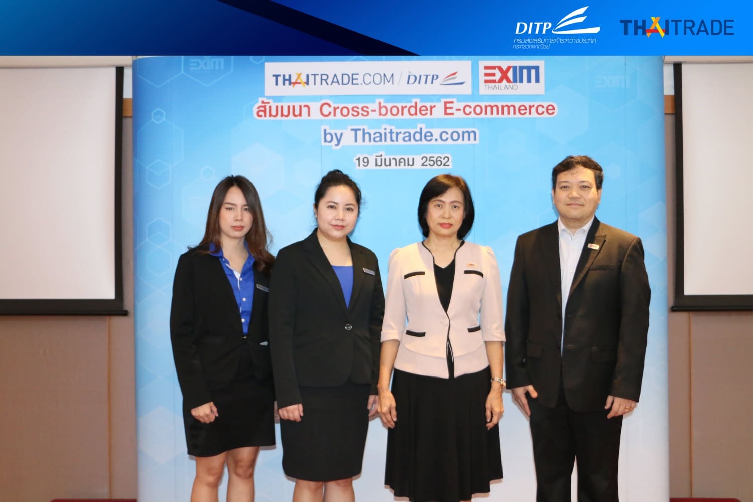 กรมส่งเสริมการค้าระหว่างประเทศ (DITP) กระทรวงพาณิชย์ ร่วมกับธนาคารเพื่อการส่งออก และนำเข้าแห่งประเทศไทย (Exim Bank) จัดกิจกรรมพัฒนาศักยภาพผู้ประกอบการ “Cross Border E-Commerce by Thaitrade.com” เพื่อให้สมาชิก Thaitrade.com สามารถใช้แพลตฟอร์มออนไลน์เพื่อสร้างยอดขายในต่างประเทศได้อย่างมีประสิทธิภาพ โดยมีผู้ประกอบการสนใจเข้าร่วมกว่า 30 ราย เมื่อวันที่ 19 มีนาคม 2562 ณ ธนาคารเพื่อการส่งออกและนำเข้าแห่งประเทศไทย พญาไท กรุงเทพฯ