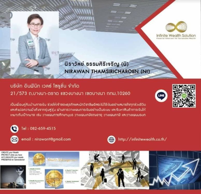 บริษัท อินฟินิท เวลธ์ โซลูชั่น จำกัด เพื่อนคู่คิดด้านการเงิน ที่ช่วยเจ้าของธุรกิจและผู้ประกอบวิชาชีพอิสระ ประหยัดภาษี และมีเงินใช้อย่างสบายใจในทุกช่วงชีวิต ผ่านการวางแผนทางการเงินอย่างเป็นระบบ พร้อมให้คำแนะนำที่เป็นกลาง ตรงไปตรงมา หากคุณไม่มีความรู้ด้านภาษี ไม่เคยคำนวณ หรือวางแผนค่าใช้จ่ายมาก่อน ไม่แน่ใจว่าต้องเริ่มอย่างไร ปรึกษาเราได้ เรามีนักวางแผนการเงินที่ผ่านการรับรองตามมาตรฐานสากลไว้คอยบริการให้คำปรึกษา และช่วงนี้มาพร้อมกับโปรโมชั่นสุดพิเศษ! โดยบริษัทฯ ยินดีให้คำแนะนำในการคำนวณภาษีเงินได้บุคคลธรรมดาครั้งแรกฟรี! ไม่มีค่าใช้จ่าย สอบถามข้อมูลเพิ่มเติมได้ที่ www.infinitewealth.co.th, Facebook: Infinite wealth solution, Line Official: @infinite.wealth หรือ โทร 082-659-4515