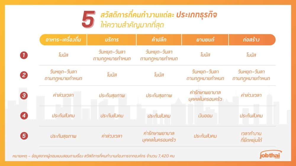 การของคนทำงานตามประเภทธุรกิจ (Industry) จากการสำรวจคนทำงานที่อยู่ ในประเภทธุรกิจที่เป็นที่ต้ องการของตลาดแรงงานมากที่สุด 5 อันดับในเว็บไซต์จ๊อบไทย ได้แก่ อาหาร–เครื่องดื่ม, บริการ, ค้าปลีก, ยานยนต์ และก่อสร้าง พบว่าโดยภาพรวมสวัสดิการที่ คนทำงานต้องการเหมือนกันคือ “โบนัส” “วันหยุด–วันลาตามกฎหมาย” และ “ประกันสังคม” ส่วนคนทำงานในประเภทธุรกิ จยานยนต์นั้นมีความต้องการสวั สดิการด้าน “ค่ารักษาพยาบาลบุคคลในครอบครัว ” และ “เงินออม” มากกว่าคนทำงานในประเภทธุรกิจอื่ น ๆ ในขณะที่คนทำงานในประเภทธุรกิ จก่อสร้างมีความต้องการสวัสดิ การด้าน “เวลาทำงานที่ยืดหยุ่นได้” มากกว่าคนทำงานในประเภทธุรกิจอื่ น ๆ