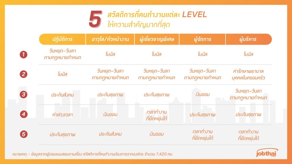 บงาน (Level) โดยระดับผู้บริหารจะให้ความสำคั ญในเรื่อง “ค่ารักษาพยาบาลบุคคลในครอบครัว ” มากกว่าคนทำงานในระดับอื่น ๆ ส่วนสวัสดิการด้าน“โบนัส” “วันหยุด–วันลาตามกฎหมาย” และ “ประกันสุขภาพ” เป็นสิ่งที่คนทำงานในทุกระดับต้ องการ