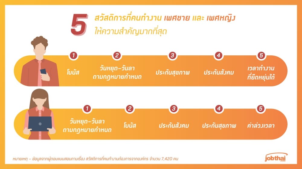 ละเพศให้ความสำคัญแตกต่างกันคือ เพศชายต้องการ “เวลาทำงานที่ยืดหยุ่นได้” ในขณะที่เพศหญิงต้องการ “เงินค่าล่วงเวลา” มากกว่า