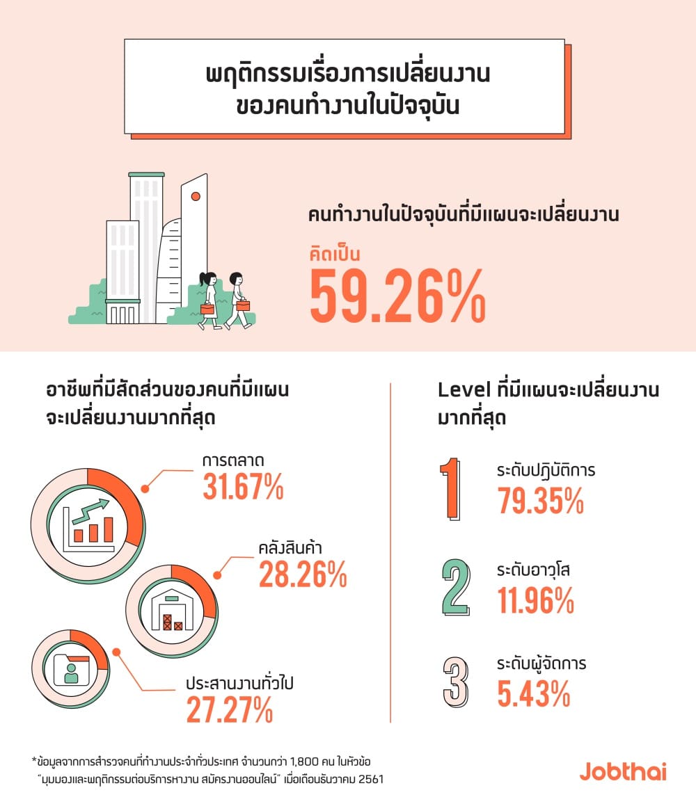 นางสาวแสงเดือน ตั้งธรรมสถิตย์ ผู้ร่วมก่อตั้งและหัวหน้าผู้บริหารด้านปฏิบัติการของจ๊อบไทย (JobThai) เปิดเผยว่า จ๊อบไทย (JobThai) ในฐานะผู้ให้บริการหางาน สมัครงาน ออนไลน์ อันดับ 1 ของประเทศไทย ได้เผยผลสำรวจพฤติกรรมและมุมมองของมนุษย์เงินเดือนทั้ง 3 เจนเนอเรชันเกี่ยวกับสถานการณ์การทำงานในปัจจุบันจากกลุ่มตัวอย่างคนทำงานประจำทั่วประเทศกว่า 1,800 คน ซึ่งเป็นกลุ่มคนที่อยากเปลี่ยนงาน (Active Job Seekers) คิดเป็น 59.26% และกลุ่มคนที่ยังไม่มีแผนจะเปลี่ยนงาน (Passive Job Seekers) คิดเป็น 40.74%