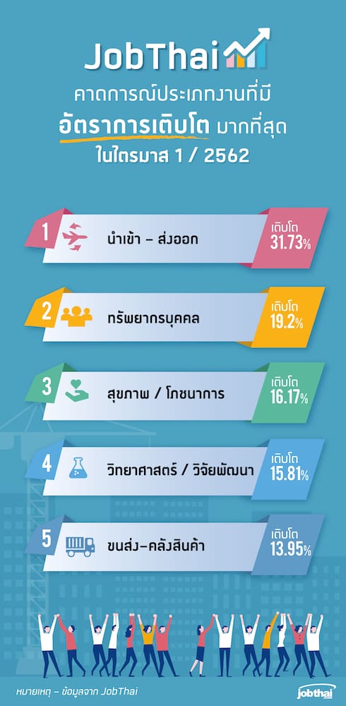 นอกจากนี้ จ๊อบไทยยังเผยให้เห็น 5 ประเภทงานที่คาดว่าจะมีอัตราการเติบโตมากที่สุดในไตรมาส 1 ปี 2562 เมื่อเทียบกับไตรมาส 4 ของปีนี้ ได้แก่ 1.งานนำเข้า-ส่งออก เติบโต 31.73 เปอร์เซ็นต์ 2.งานทรัพยากรบุคคล เติบโต 19.2 เปอร์เซ็นต์ 3.งานสุขภาพ/โภชนาการ เติบโต 16.17 เปอร์เซ็นต์ 4.งานวิทยาศาสตร์/วิจัยพัฒนา เติบโต 15.81 เปอร์เซ็นต์ และ 5.งานขนส่ง-คลังสินค้า เติบโต 13.95 เปอร์เซ็นต์ ตามลำดับ ซึ่งจะเห็นได้ว่าประเภทงานข้างต้นที่มีแนวโน้มการเติบโตที่สดใสนั้น สืบเนื่องจากปัจจัยสภาพเศรษฐกิจไทยที่มีแนวโน้มขยายตัวชัดเจนและต่อเนื่อง โดยแรงขับเคลื่อนหลักมาจากการใช้จ่ายภาคเอกชนทั้งการบริโภคและการลงทุนที่มีแนวโน้มขยายตัวดีขึ้น ตลอดจนแรงสนับสนุนจากโครงการลงทุนของภาครัฐที่ชัดเจนมากขึ้น อาทิ โครงการลงทุนโครงสร้างพื้นฐาน โครงการพัฒนาระเบียงเศรษฐกิจพิเศษภาคตะวันออก (EEC) ฯลฯ นอกจากนี้ภาคการส่งออกสินค้าก็มีแนวโน้มขยายตัวดีขึ้นตามอุปสงค์โลก และโรดแมปเลือกตั้งครั้งแรกในรอบ 8 ปีก็เป็นอีกสิ่งหนึ่งที่จะช่วยทำให้บรรยากาศการลงทุนในประเทศเริ่มกลับมาคึกคัก ซึ่งทั้งหมดนี้จะส่งผลดีมาถึงความต้องการแรงงานภาพรวมทั่วประเทศ นางสาวแสงเดือน กล่าวทิ้งท้าย
