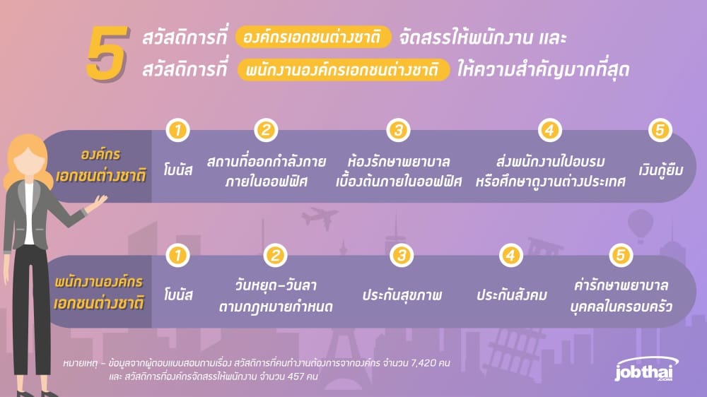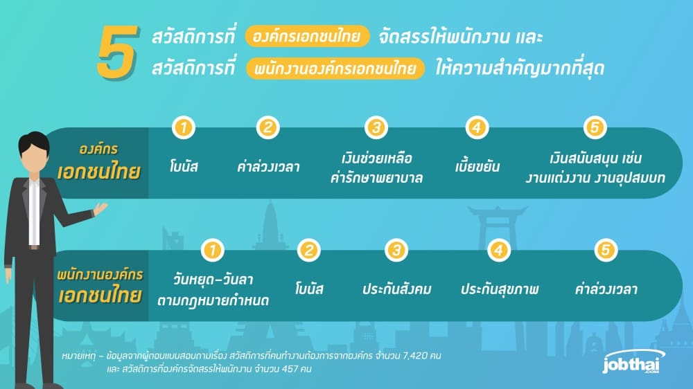 จากผลสำรวจข้างต้นจะเห็นว่าความต้องการด้านสวัสดิการจากฝั่งพนักงานทั้ง 4 ประเภทองค์กรนั้น สวัสดิการเรื่องโบนัส และวันหยุด-วันลาตามกฎหมายกำหนด ยังคงเป็นสวัสดิการที่คนทำงานทุกองค์กรให้ความสำคัญมาเป็นอันดับต้น ๆ และอีกหนึ่งสวัสดิการที่คนทำงานทุกประเภทองค์กรต้องการเหมือนกัน ได้แก่ สวัสดิการด้านสุขภาพ ไม่ว่าจะเป็นประกันสุขภาพ ประกันสังคม ประกันอุบัติเหตุ สืบเนื่องจากคนทำงานส่วนใหญ่ใช้เวลาอยู่ในที่ทำงานไม่ต่ำกว่า 40 ชั่วโมงต่อสัปดาห์ ทำให้คนทำงานอาจมีพฤติกรรมต่าง ๆ ที่เสี่ยงต่อการเกิดปัญหาด้านสุขภาพได้ เช่น การทานอาหารที่ไม่เหมาะสม ตลอดจนความเครียดที่เกิดจากการทำงาน ดังนั้นการดูแลสุขภาพของคนทำงานจึงเป็นเรื่องที่สำคัญ นอกจากนี้หากองค์กรสามารถจัดสรรสวัสดิการที่สอดคล้องกับไลฟ์สไตล์ของคนทำงานในยุคปัจจุบันได้ ก็จะช่วยดึงดูดให้คนอยากเข้ามาทำงานกับองค์กร และยังช่วยให้พนักงานมีความสุขในการทำงาน ซึ่งจะส่งผลต่อประสิทธิภาพในการทำงานของพนักงานที่ดีขึ้นได้อีกด้วย
