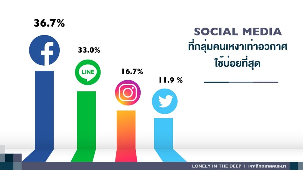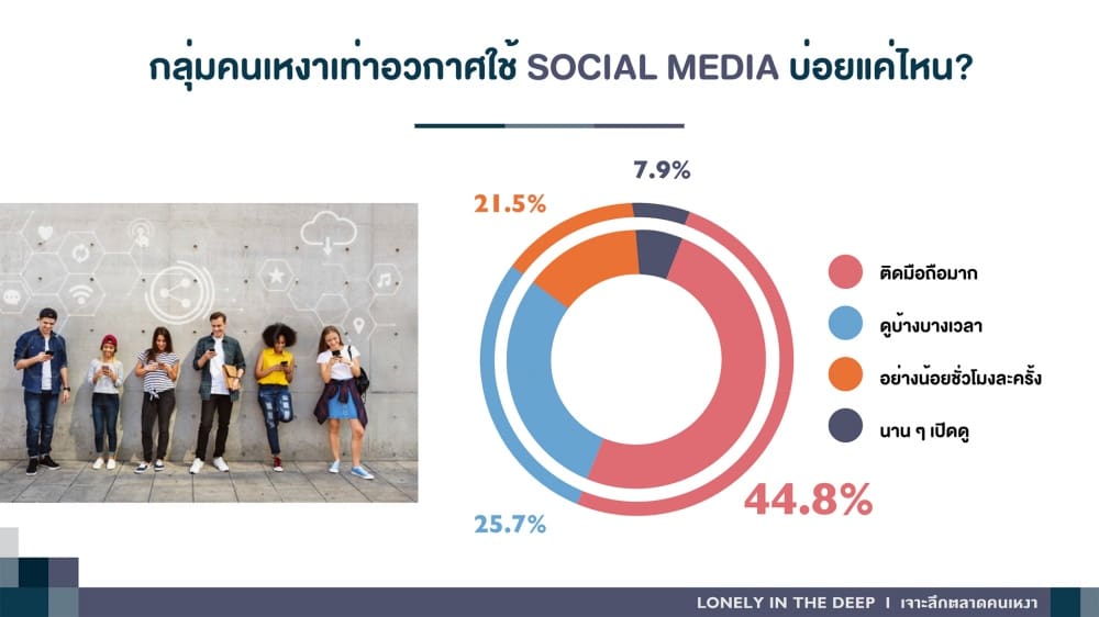 - สื่อสารเหมือนเพื่อน (M: coMpanion) จากสถิติพบว่า ร้อยละ 44.3 ของกลุ่มผู้มีภาวะความเหงา มักจะติดการใช้โซเชียลมีเดียตลอดทั้งวัน เพื่อให้การสื่อสารมีประสิทธิภาพ และตรงกับกลุ่มเป้าหมายมากที่สุด การทำการตลาดจึงควรเลือกสื่อสาร โปรโมท หรือสร้างกิจกรรมปฏิสัมพันธ์ กับกลุ่มเป้าหมายผ่านสื่อโซเชียลมีเดีย รวมถึงต้องปรับเปลี่ยนรูปแบบการสื่อสารที่เป็นมิตร เสมือนเพื่อนที่คอยให้คำปรึกษา และไขข้อสงสัยผลิตภัณฑ์และบริการได้ตลอดเวลา