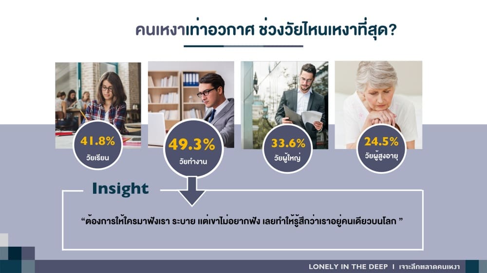 ดร. บุญยิ่ง กล่าวเพิ่มว่า ผลสำรวจภาวะความเหงาของประชากรในสหรัฐอเมริกา ของมหาวิทยาลัยแคลิฟอร์เนีย ลอสแองเจลิส พบว่า กลุ่มเยาวชนเจเนอเรชั่นซี (Gen Z) อายุระหว่าง 18 – 22 ปี เป็นกลุ่มที่ประสบภาวะเหงาสูงสุด โดยผลสำรวจดังกล่าว สอดคล้องกับข้อมูลงานวิจัยการตลาดในกลุ่มคนเหงา ในประเทศไทย ของวิทยาลัยฯ ที่พบว่าร้อยละ 40.4 หรือราว 1 ใน 3 ของกลุ่มสำรวจประสบภาวะความเหงาในระดับสูง โดยช่วงอายุที่มีแนวโน้มความเหงาสูงสุด 3 อันดับแรก ได้แก่ กลุ่มวัยทำงาน อายุระหว่าง 23 – 40 ปี ครองอันดับสูงสุดถึงร้อยละ 49.3 เยาวชนวัยเรียน อายุระหว่าง 18 – 22 ปี ร้อยละ 41.8 และ วัยผู้ใหญ่ อายุระหว่าง 41– 60 ปี ร้อยละ 33.6 ในขณะที่กลุ่มผู้สูงวัยอายุมากกว่า 60 ปี กลับประสบภาวะความเหงาเพียงร้อยละ 24.5 เนื่องจากมีความพร้อมด้านการจัดการอารมณ์ และรายได้เพื่อใช้ในการประกอบกิจกรรมแก้เหงาเพิ่มสูงขึ้น ตามอายุที่เพิ่มขึ้น