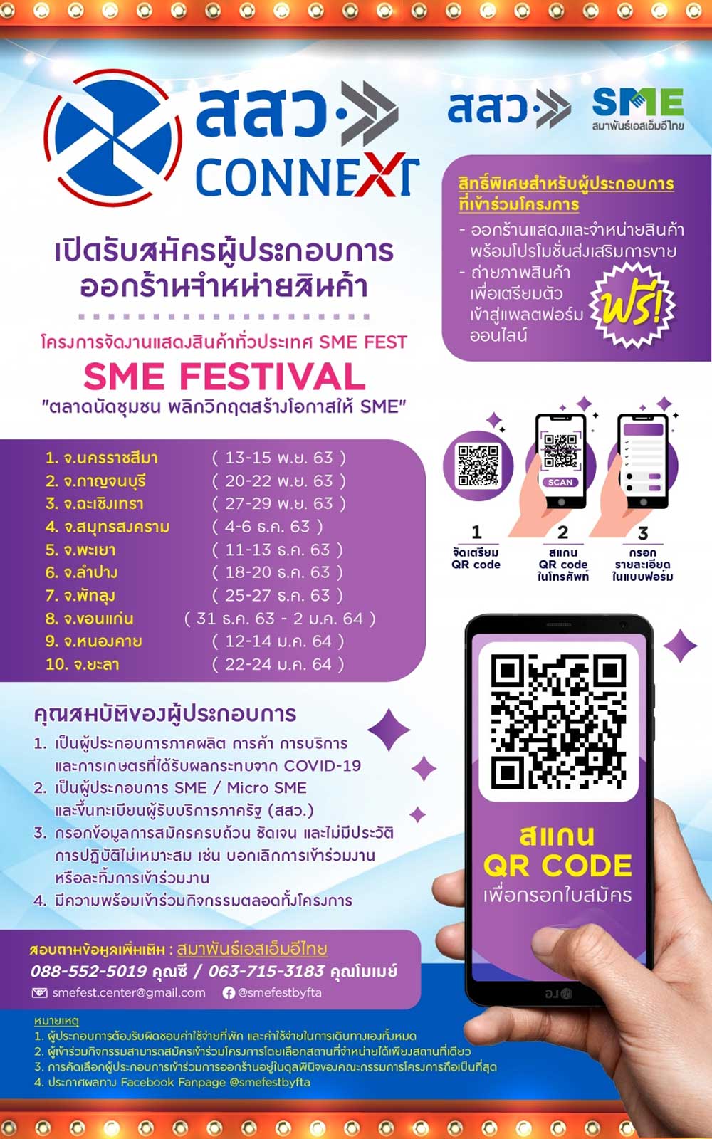 “งานแสดงสินค้า สสว. CONNEXT : SME Festival “ตลาดนัดชุมชน พลิกวิกฤต สร้างโอกาส ให้ SME” ภายใต้โครงการจัดงานแสดงสินค้าทั่วประเทศ SME FEST เกิดขึ้นเพื่อช่วยเหลือกลุ่มผู้ประกอบการเอสเอ็มอี / ไมโคร เอสเอ็มอี ภาคการผลิต การค้า และการบริการ ที่ได้รับผลกระทบจากสภาวะเศรษฐกิจชะลอตัว ได้แก่ สงครามการค้าสหรัฐ-จีน และ โควิด–19 จำนวนกว่า 2,000 ราย โดยมีวัตถุประสงค์สำคัญคือ เพื่อเพิ่มช่องทางในการแสดงและจำหน่ายสินค้าให้แก่ผู้ประกอบการเอสเอ็มอี การสร้างโอกาสทางการตลาดและบรรเทาผลกระทบจากสภาวะเศรษฐกิจให้แก่ผู้ประกอบการ รวมถึงเป็นการสร้างรายได้ให้กับเอสเอ็มอีและกระจายรายได้ให้เกิดการหมุนเวียนทั่วประเทศ”