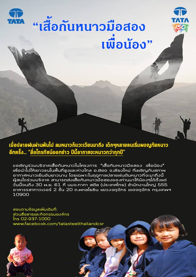 บริษัท ทาทา สตีล (ประเทศไทย) จำกัด (มหาชน) เชิญชวนร่วมบริจาคเสื้อกันหนาวในโครงการ “เสื้อกันหนาวมือสอง เพื่อน้อง” เพื่อนำไปให้เยาวชนในพื้นที่สูงและห่างไกล อ.ฮอด จ.เชียงใหม่ ที่เผชิญกับสภาพอากาศหนาวเย็นอันยาวนาน โดยเฉพาะในฤดูกาลปลายฝนต้นหนาวที่จะมาถึงนี้ สำหรับผู้ที่สนใจร่วมบริจาค สามารถส่งเสื้อกันหนาวมือสองของท่านมาให้น้องๆ ได้ตั้งแต่วันนี้จนถึง 30 พฤศจิกายน 2561 ที่ บริษัท ทาทา สตีล (ประเทศไทย) จำกัด(มหาชน) สำนักงานใหญ่ 555 อาคารรสาทาวเวอร์ 2 ชั้น 20 ถนนพหลโยธิน แขวงจตุจักร เขตจตุจักร กรุงเทพมหานคร 10900 หรือติดต่อสอบถามข้อมูลเพิ่มเติมได้ที่ ส่วนสื่อสารและกิจกรรมองค์กร โทรศัพท์ 02-937-1000 หรือเข้าไปที่ www.facebook.com/tatasteelthailandcsr