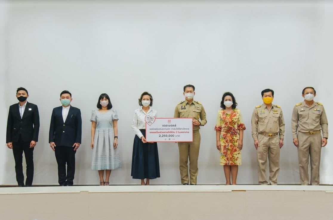 ทั้งนี้ ทางบริษัท เดอะมอลล์ กรุ๊ป จำกัด นำโดย กฤษณา อัมพุช รองประธานกรรมการ พร้อมคณะผู้บริหาร ได้ร่วมส่งมอบเครื่องช่วยหายใจ จำนวน 5 เครื่อง ให้กับ 3 โรงพยาบาลหลักในจังหวัดนครราชสีมา ได้แก่ โรงพยาบาลมหาราชนครราชสีมา (จำนวน 3 เครื่อง), โรงพยาบาลเทพรัตน์นครราชสีมา (จำนวน 1 เครื่อง) และโรงพยาบาลมหาวิทยาลัยเทคโนโลยีสุรนารี (จำนวน 1 เครื่อง) รวมมูลค่าทั้งสิ้น 2,250,000 บาท โดยได้รับเกียรติจาก ท่านวิเชียร จันทรโณทัย ผู้ว่าราชการจังหวัดนครราชสีมา และ ณัฏฐินีภรณ์ จันทรโณทัย นายกเหล่ากาชาดจังหวัดนครราชสีมา ร่วมเป็น สักขีพยานในพิธี พร้อมด้วย นายแพทย์สุรัตน์ ส่งวิรุฬห์ รองผู้อำนวยการฝ่ายการแพทย์ โรงพยาบาลมหาราชนครราชสีมา นายแพทย์จิรศักดิ์ วิจักขณาลัญฉ์ ผู้อำนวยการโรงพยาบาลเทพรัตน์นครราชสีมา และ อ.นพ.ดร.นิวัฒน์ชัย นามวิชัยศิริกุล ผู้อำนวยการโรงพยาบาลมหาวิทยาลัยเทคโนโลยีสุรนารี เป็นผู้รับมอบ ณ ศาลากลางจังหวัดนครราชสีมา