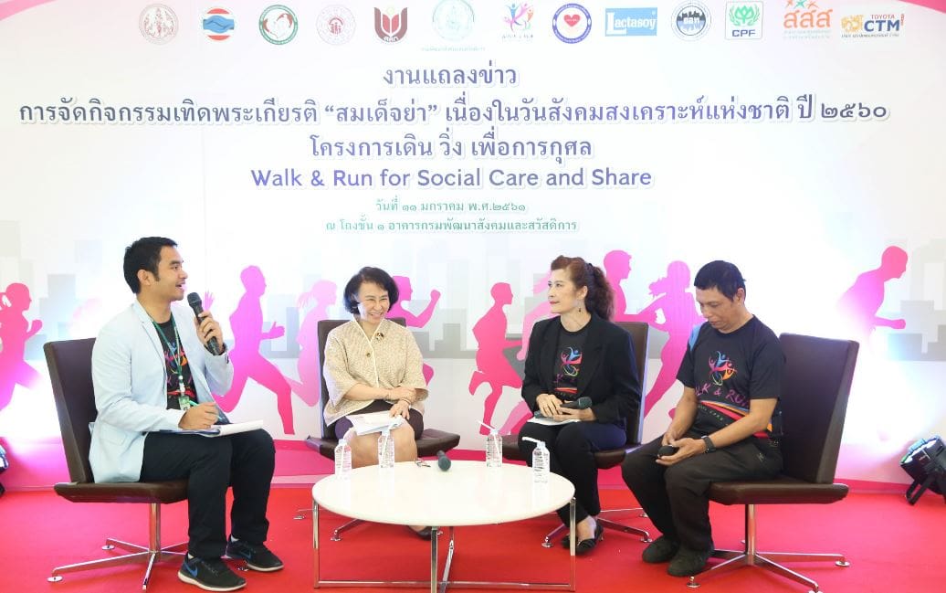 วันพฤหัสบดีที่ ๑๑ มกราคม ๒๕๖๑ เวลา ๐๙.๐๐ น. นางนภา เศรษฐกร อธิบดีกรมพัฒนาสังคมและสวัสดิการ ประธานฯ พร้อมด้วย นายกสมาคมสังคมสงเคราะห์ทางการแพทย์ไทย และอุปนายกสมาคมนักสังคมสงเคราะห์ทางการแพทย์ไทย เปิดการแถลงข่าวฯ กิจกรรมเทิดพระเกียรติ “สมเด็จย่า” เนื่องในวันสังคมสงเคราะห์แห่งชาติ ปี ๒๕๖๐ โครงการเดิน วิ่ง เพื่อการกุศล Walk & Run for Social Care and Share ณ ห้องโถงชั้น ๑ กรมพัฒนาสังคมและสวัสดิการ