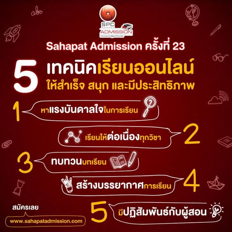 5 เคล็ดลับแบบฉบับการเรียนออนไลน์ เทคนิคเหล่านี้จะช่วยให้น้อง ๆ ติวเข้มออนไลน์กับโครงการสหพัฒน์แอดมิชชั่นได้อย่างมีประสิทธิภาพ จนสามารถสอบเข้ามหาวิทยาลัยที่ต้องการได้สำเร็จ