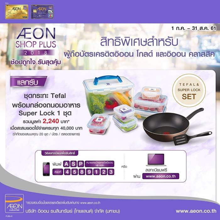 บริษัท อิออน ธนสินทรัพย์ (ไทยแลนด์) จำกัด (มหาชน) จัดแคมเปญ “AEON Shop Plus 2018 ช้อปถูกใจ รับสุดคุ้ม” สิทธิพิเศษเฉพาะผู้ถือบัตรเครดิตอิออน โกลด์ และบัตรเครดิตอิออน คลาสสิค เพียงสะสมยอดใช้จ่ายครบทุก 40,000 บาท แลกรับ ชุดกระทะ Tefal พร้อมกล่องถนอมอาหาร Super Lock เพียงลงทะเบียนรับสิทธิ์ด้วย SMS พิมพ์ ASP ตามด้วยหมายเลขบัตรเครดิตอิออน 16 หลักส่งมาที่ 4589123 หรือลงทะเบียนผ่านทางเว็บไซต์ของอิออน ตั้งแต่ 1 ก.ค. ถึง 31 ส.ค. นี้เท่านั้น