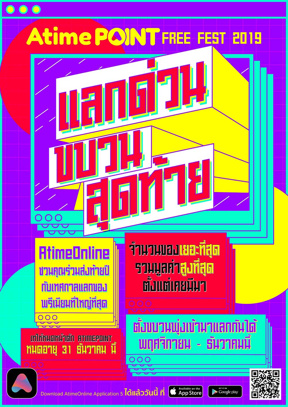 AtimeOnline ชวนคุณร่วมส่งท้ายปี กับเทศกาลแลกของพรีเมียมที่ใหญ่ที่สุด จำนวนของเยอะที่สุด มูลค่ารวมสูงที่สุดตั้งแต่เคยมีมา กับกิจกรรม AtimePoint Free Fest 2019 แลกด่วน ขบวนสุดท้าย (เอ-ไทม์พ้อยท์ ฟรี เฟส 2019 แลกด่วน ขบวนสุดท้าย) เพียงลงทะเบียนเข้าร่วมกิจกรรม ผ่าน AtimeOnline Application แล้วนำพ้อยท์จากการฟังที่สะสมตลอดปี มากดแลกรับรางวัลง่ายๆ ได้ ทุกวันจันทร์ ,พุธ และศุกร์ ตั้งแต่เวลา 12.00 น. เป็นต้นไป พร้อมตั้งขบวนพุ่งเข้ามาแลกกันได้ตลอดเดือนพฤศจิกายน – ธันวาคมนี้ ติดตามรายละเอียดเพิ่มเติมได้ทาง Facebook : AtimeOnline และ www.atimeonline.com /game สาวกเอ-ไทม์ต้องรีบแล้ว! เพราะ AtimePoint จะหมดอายุในวันที่ 31 ธันวาคมนี้ และจะเริ่มหนับหนึ่งใหม่ในปีหน้านะจ๊ะ…