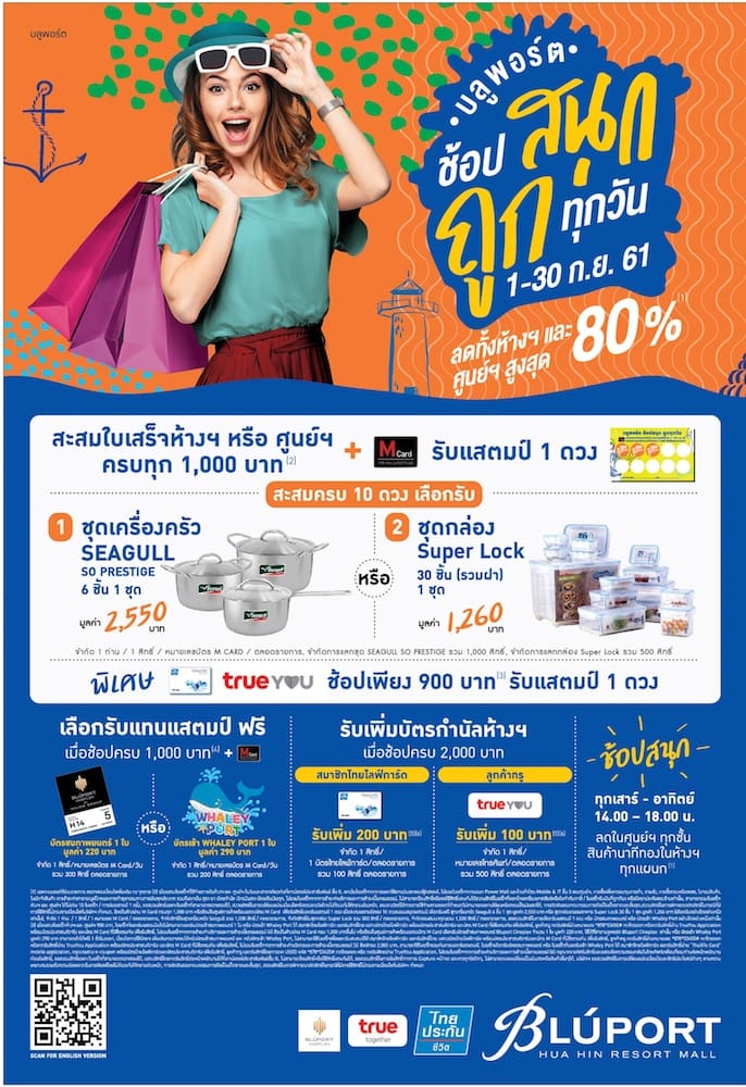 บลูพอร์ต หัวหิน รีสอร์ท มอลล์ ร่วมกับ บริษัทไทยประกันชีวิต จำกัด (มหาชน) และบริษัท ทรู คอปอร์เรชั่น จำกัด (มหาชน) คืนกำไรให้กับนักช้อป จัดงาน “บลูพอร์ต ช้อปสนุกถูกทุกวัน 2” มหกรรมลดราคาทั้งห้างฯ และศูนย์ฯ สูงสุด 80 % พร้อมสะสมแสตมป์แลกรับของสมนาคุณฟรีมากมาย