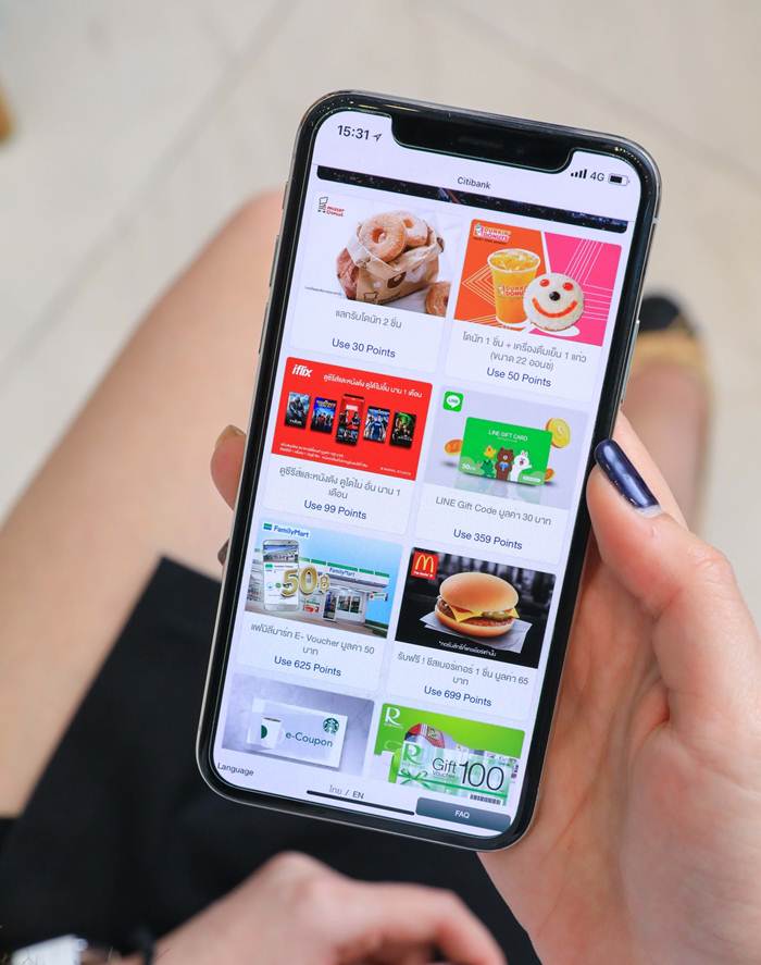 เพียงแค่มีคะแนนสะสมซิตี้ รีวอร์ด และ ซิตี้ไลน์แอปพลิเคชั่นในสมาร์ทโฟน ก็สามารถแลกความสุขและแลกรับบริการจากร้านค้าและร้านอาหารชั้นนำต่างๆมากมายได้ทั้งวัน แม้ไม่พกกระเป๋าสตางค์ เริ่มต้นจากการแวะดื่มกาแฟตอนเช้าที่สตาร์บัคส์พร้อมกินโดนัทที่ดังกิ้น โดนัท ทานกลางวันที่แมคโดนัลด์ ตามด้วยไอศครีมของว่างยามบ่ายที่สเวนเซ่นส์ ซื้อของเบาๆ ก่อนกลับบ้านตอนเย็นที่เซ็นทรัล ถ้าลืมซื้ออาหารเย็นก็แวะเข้าแฟมิลี่มาร์ท ซื้อของง่ายๆ กินอยู่สบายได้ทั้งวันโดนไม่เสียสตางค์ เพียงสามคลิก ผ่านซิตี้ไลน์ แอปพลิเคชั่น ก็สามารถแลกได้ รับไว และใช้ได้ทันที สอบถามรายละเอียดเพิ่มเติมได้ที่ ธนาคารซิตี้แบงก์ ประเทศไทย หรือที่ www.citibank.co.th