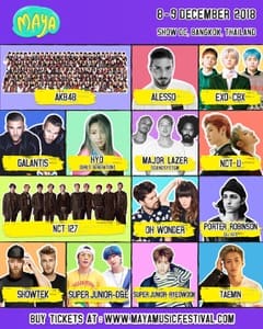 และในปีนี้ MAYA ขอเพิ่มสีสันเอาใจคอดนตรีฝั่ง ASIAN แบบจัดเต็มด้วยการสร้างปรากฏการณ์การรวมกันของเหล่า K-POP อันดับต้นๆบนเวทีเดียวกัน ไม่ว่าจะเป็น EXO-CBX(CHEN, BAEKHYUN , XIUMIN) , HYO (GIRLS’ GENERATION), NCT U (TAEYONG,TEN), NCT 127 (TAEIL ,JOHNNY , TAEYONG ,YUTA ,DOYOUNG ,JAEHYUN ,WINWIN ,MARK ,HAECHAN ,JUNGWOO), SUPER JUNIOR-D&E (DONGHAE , EUNHYUK) , SUPER JUNIOR RYEOWOOK,TAEMIN และสุดพิเศษเอาใจชาว J-POP กับ โชว์แบบ FULL TEAM 16 คน จาก สาวๆ AKB48ครั้งแรกในประเทศไทย!! พร้อมกับ กิจกรรม Handshake Party (งานจับมือ) ที่แฟนคลับทุกคนจะได้มีโอกาสเข้าร่วมด้วย เรียกได้ว่างาน MAYA ปีนี้ จัดไลน์อัพศิลปิน INTERNATIONAL มาแบบเน้นๆ เต็มสูบมากที่สุดในประเทศไทย สมกับเป็น INTERNATIONAL MUSIC FESTIVAL อย่างแท้จริง!!
