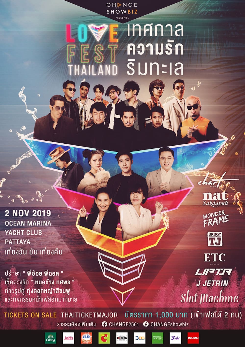 CHANGE SHOWBIZ (เช้นจ์ โชว์บิส) บริหารงานโดย เจ้าแม่โชว์บิส อย่าง พี่ฉอด-สายทิพย์ มนตรีกุล ณ อยุธยา ขอเอาใจคนโสด เศร้า เหงา อินเลิฟ ทั่วประเทศ กับ “LOVE FEST” (เลิฟ เฟส)เทศกาลแห่งความรักริมทะเลสุดยิ่งใหญ่ครั้งแรกในประเทศ ที่ไม่ว่าสเตตัสความรักของคุณจะเป็นเช่นไร ขอแค่พาหัวใจมาฟังเสียงเพลง เคล้าเสียงคลื่นไปด้วยกัน ณ OCEAN MARINA YACHT CLUB (โอเชี่ยน มาริน่า ยอร์ช คลับ) พัทยา กับการจัดงานแบบเต็มพื้นที่รองรับได้กว่า 10,000 ชีวิต แถมงานนี้เหล่าบรรดกองทัพศิลปินไม่ว่าจะเป็น ETC (อีทีซี) / เจ เจตริน / SLOT MACHINE (สล็อต แมชชีน) / LIPTA (ลิปตา) /ณัฐ ศักดาทร / WONDERFRAME (วันเดอร์เฟรม) และ ชาติ – สุชาติ ยังขนเพลลิสเพลงรักมาเพียบบบ การันตีได้เลยว่า เพลงเศร้าก็ขยี้ไปถึงขั้วหัวใจ เพลงรักก็ฟินกันไปแบบสุดๆ เพลงแด๊นซ์ก็มันส์แบบหยุดไม่อยู่อย่างแน่นอน