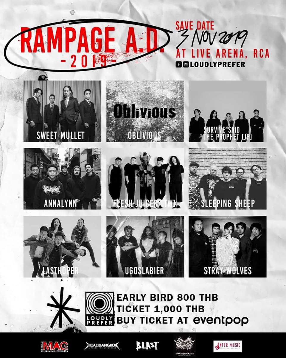 LOUDLY PREFER (ลาวด์ลี่ ฟรีเฟอร์) กลุ่มคนชอบเสียงดัง บุคคลเบื้องหลังงานคอนเสิร์ตและเฟสติวัลทั้งไทยและต่างประเทศมานับไม่ถ้วน ด้วยประสบการณ์ที่สั่งสมและทักษะการทำงานด้านนี้มาอย่างโชกโชน กับหัวใจสายร็อคอย่างแท้จริง วันนี้พวกเขามารวมตัวกันในชื่อ LOUDLY PREFER พร้อมกับการสร้างปรากฏการณ์มหกรรมดนตรีร็อคเต็มรูปแบบครั้งใหม่ จัดเต็มกับ Production ทั้งแสงสีเสียง แบบเทหมดหน้าตัก ในงาน RAMPAGE A.D.2019 (แรมเพจ เอ.ดี.2019) ครั้งแรกในประเทศไทย!! งานรวมคนบ้าคลั่งทางดนตรีแห่งยุคสมัย สุดท้าทายกับไลน์อัพศิลปินสายร็อคแบบจัดหนักกันแบบจุกๆ ทั้งไทยและเทศ คว้าวง SURVIVE SAID THE PROPHET (เซอร์ไวฟ์ เซด เดอะ โพรเฟด) อัลเทอร์นาทีฟ-โพสฮาร์ดคอร์ของแรงจากประเทศญี่ปุ่น กับโชว์เต็มรูปแบบครั้งแรกในประเทศไทย!!! และ ใน South East Asia พร้อมอุ่นเครื่องให้สายร็อคชาวไทยได้มันส์กันก่อนใคร จัดหนักอย่างต่อเนื่องกับ วงร็อคเมนสตรีมแถวหน้าอย่าง SWEET MULLET (สวีท มัลเล็ท) ที่จะมาส่งต่อความมันส์กันแบบสุดเหวี่ยงบนเวที กับเพลงSide B ที่แทบจะไม่เคยได้เล่นที่ไหนมาก่อน ปะทะกับ วง OBLIVIOUS (อ๊อปลิเวียส) อัลเทอร์เนทีฟเมทัลสุดเก๋า ที่จะมาปล่อยของกันแบบไม่มีกั๊ก เสริมทัพความมันส์กันแบบเต็มสูบกับการกลับมาอาละวาดอีกครั้งบนเวทีนี้ หลังประกาศพักวงแบบไม่มีกำหนด ของ วง LASTHOPER (ลาสโฮปเปอร์) ที่เรียกได้ว่าเป็นปรากฎการณ์ที่เป็นที่สุดของสายเมทัลในรอบปีนี้เลยทีเดียว วง ANNALYNN (แอนนาลีน) วงเมทัลคอร์แถวหน้าของประเทศที่ไปสร้างความมันส์มาแล้วทั่วเอเชีย วง UGOSLABIER (ยูโกสลาเบียร์) วงโพสต์ฮาร์ดคอร์ สครีโมตัวแรง ที่พร้อมใส่ความบ้าคลั่งให้กับทุกคนแบบเกินร้อย STRAY WOLVES (สเตรย์ วูฟ) วงโพสต์ฮาร์ดคอร์หน้าใหม่ไฟแรง และ SLEEPING SHEEP (สลีปปิ้ง ชีป) วงดนตรีที่มีเพลงร็อคเป็นชีวิต นอกจากนี้ LOUDY PREFER ยังขอเสิร์ฟความมันส์แบบไม่มียั้งกับ 1วงร็อคสุดเดือดจากต่างประเทศ กับ FLESH JUICER (เฟลช จุ๊ยเซอร์) วงเมทัลสุดบ้าคลั่ง จาก ประเทศไต้หวัน กับเอกลักษณ์เฉพาะตัวที่ไม่เหมือนใคร ที่สำคัญยังจะได้เห็น JAM SESSION แบบเดือดๆที่ไม่เคยเห็นที่ไหนมาก่อนบนเวทีนี้อีกด้วย