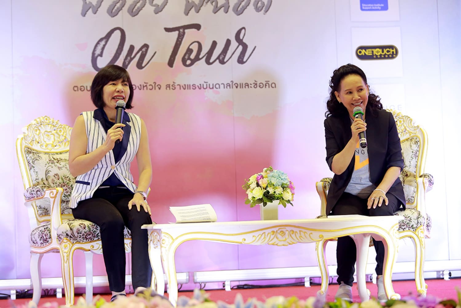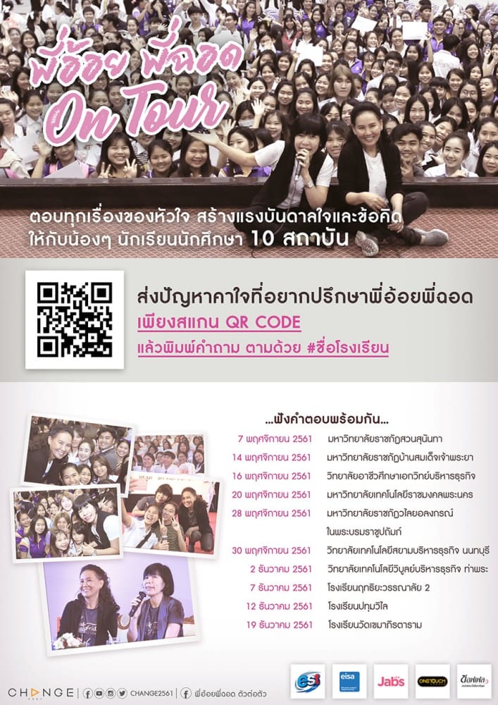 โดยประเดิมไปเรียบร้อยแล้วกับ สถาบันแรก มหาวิทยาลัยราชภัฏสวนสุนันทา ที่เหล่านักศึกษาต่างให้ความสนใจกันอย่างคับคั่ง ยกมือถาม และระบายความในใจกันอย่างคึกคักจนตอบแทบไม่ไหว ถึงกับต้องต่อเวลากันเลย โดยบรรยากาศในการบรรยายตลอด 2 ชั่วโมง เต็มไปด้วยรอยยิ้ม เสียงหัวเราะ ตลอดจนแอบน้ำตาซึมกันก็มี เรียกได้ว่านอกจากได้สาระแล้วยังได้ความสนุกผ่อนคลายกันแบบครบรสเลยทีเดียว โดยน้องๆในสถาบันอื่นๆ ถ้าอยากพบกับสาระความสนุกของการไขปัญหาหัวใจ พร้อมรับแรงบันดาลและข้อคิดดีๆจากพี่อ้อยพี่ฉอด สามารถ ฝากคำถามพร้อมแฮชแท็กชื่อโรงเรียน ไว้ที่Facebook Fanpage “พี่อ้อยพี่ฉอดตัวต่อตัว” (www.facebook.com/paoypchod.change2561/) ซึ่งทางทีมงานจะทำการคัดเลือกสถาบันต่างๆ เพื่อพบกันใน “พี่อ้อยพี่ฉอด On Tour” ครั้งต่อไป