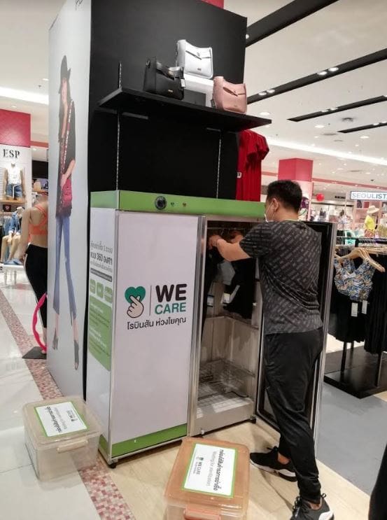 2.สำหรับสินค้าทุกชิ้น ที่มีการทดลองสวมใส่ พนักงานจะนำไปฆ่าเชื้อในตู้อบหลังเวลาปิดให้บริการ 3 ระบบ คือ การอบลมร้อน, ฉายรงสี UV และปิดท้ายด้วยการอบโอโซน เพื่อให้มั่นใจว่า ปลอดเชื้อทุกซอกทุกมุมแบบ 360 องศา