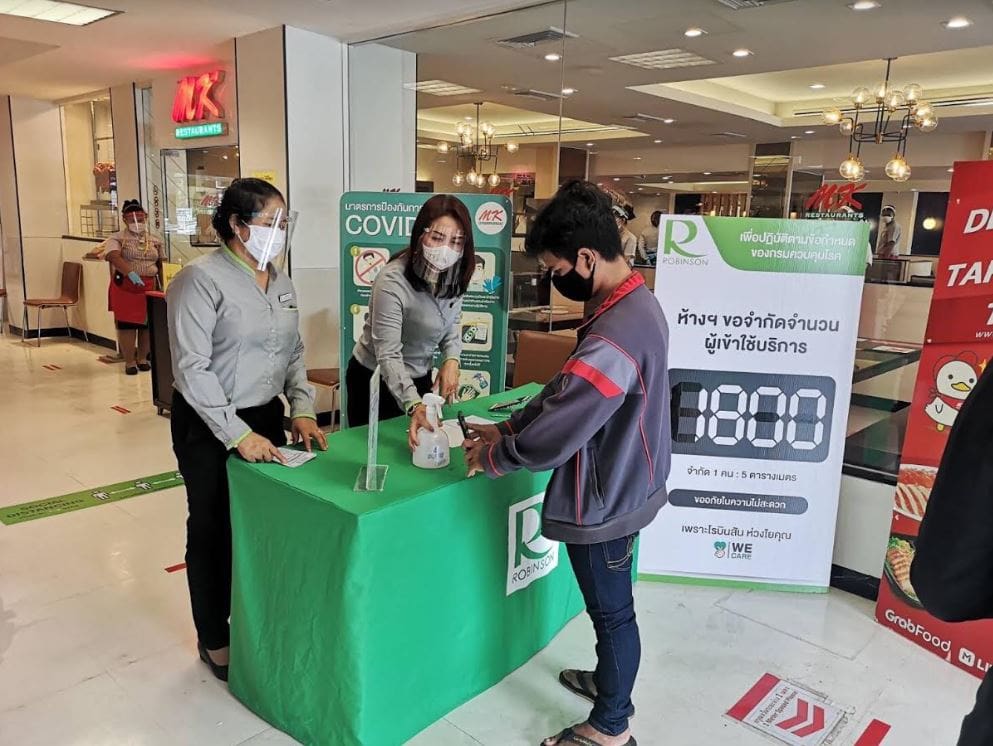 ลูกค้ามั่นใจได้ตั้งแต่มาถึง ทางโรบินสันได้จัดเตรียมการลงทะเบียนเพื่อคัดกรองผู้เข้าใช้บริการภายในห้างฯ และศูนย์การค้าฯ ผ่าน QR CODE สำหรับให้ลูกค้าลงทะเบียนในแอพพลิเคชั่น “ไทยชนะ” และได้มีการคัดกรองเข้มงวดตั้งแต่ลูกค้าเข้าศูนย์ฯ ทุกคนต้องตรวจวัดอุณหภูมิ (ขอสงวนสิทธิ์ผู้มีอุณหภูมิเกิน 37.5 องศา งดเข้าพื้นที่โดยเด็ดขาด) มีบริการ เจลล้างมือ และเหยียบพรมเช็ดเท้าฆ่าเชื้อ นอกจากนี้ยังมีมาตรฐานรักษาระยะห่างทางสังคม หรือ Social Distancing ทุกจุด ทั้งในส่วนของการจำกัดจำนวนคนเข้าศูนย์การค้าและร้านค้าไม่เกิน 1 คน ต่อ 5 ตร.ม.ควบคุมด้วยระบบ People Counting แบบเรียลไทม์ สำหรับพื้นที่ส่วนกลาง ลิฟต์-บันไดเลื่อน-ห้องน้ำ – Rest Area – ห้อง V.I.P. LOUNGE ต้องรักษาระยะห่าง 1.5 – 2 ม. ทุกจุด รวมถึงการให้พนักงานที่มีความใกล้ชิดกับลูกค้าสวมใส่หน้ากากอนามัย Face Shield และถุงมือ ตลอดระยะเวลาที่ปฏิบัติงาน และทุกเคาน์เตอร์แคชเชียร์จะต้องมี Counter Shield ตลอดจนการส่งเสริมการใช้การชำระเงินแบบ Cashless และ E-payment, บริการถุงใส่เงินทอนที่จุดแคชเชียร์ทุกร้านค้า