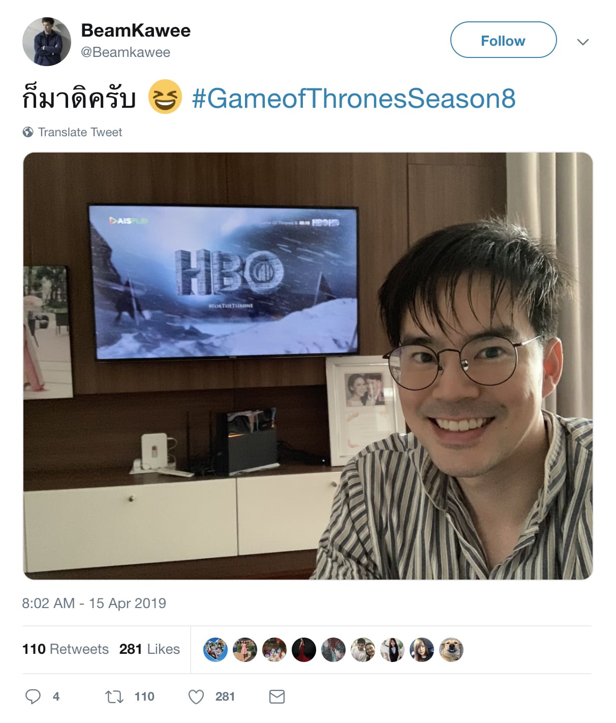 ยิ่งไปกว่านั้น Ep. แรกของซีซันนี้ที่ได้ออกอากาศครั้งแรกเมื่อวันที่ 15 เม.ย. ที่ผ่านมา (ตามเวลาประเทศไทย) มีผู้ทวีตถึงมากกว่า 5 ล้านข้อความ และเฉพาะในปี 2562 ที่ผ่านไปเพียงไม่กี่เดือน ปรากฎว่ามีคนทวีตถึงซีรีส์ยอดฮิตเรื่องนี้มากกว่า 52 ล้านข้อความแล้ว