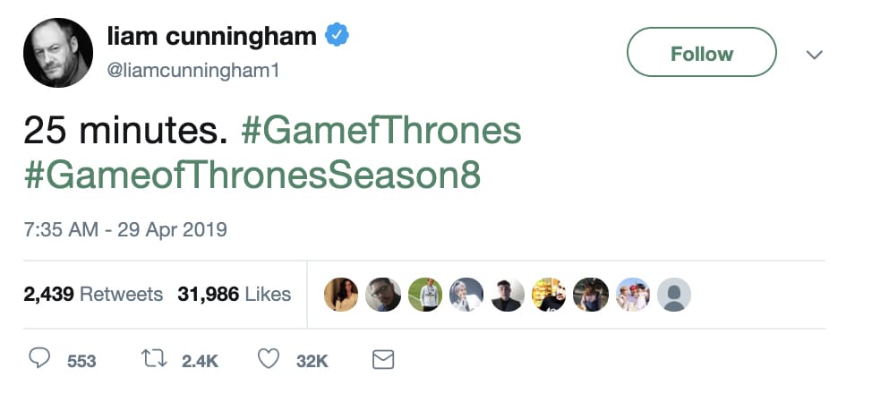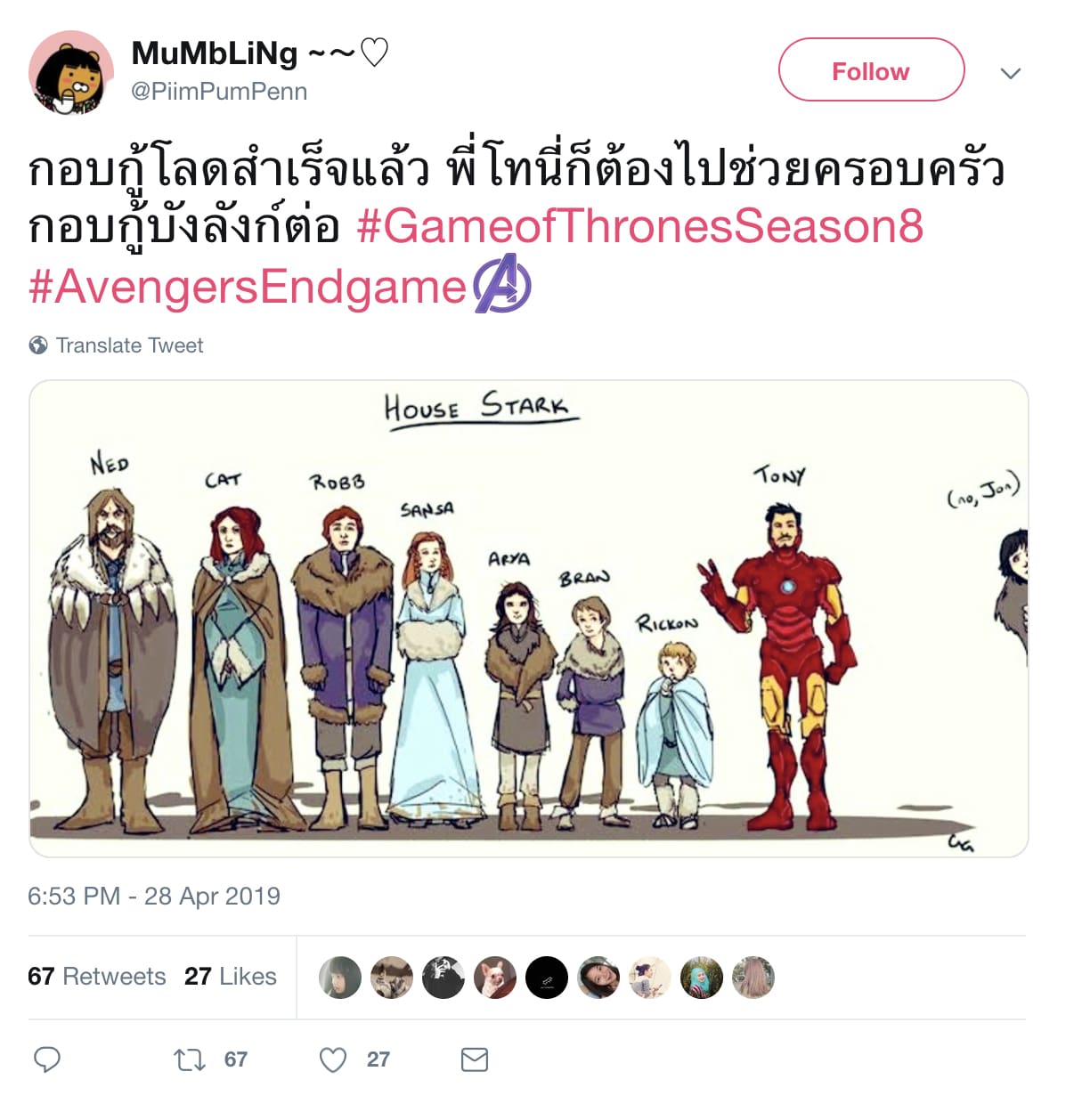 และทวีตที่ได้รับความนิยมคงไม่พ้นทวีตที่มีอารมณ์ขันโดยเป็นการผสมกันระหว่างเรื่องของ #GameOfThrones และ #AvengersEndGame.