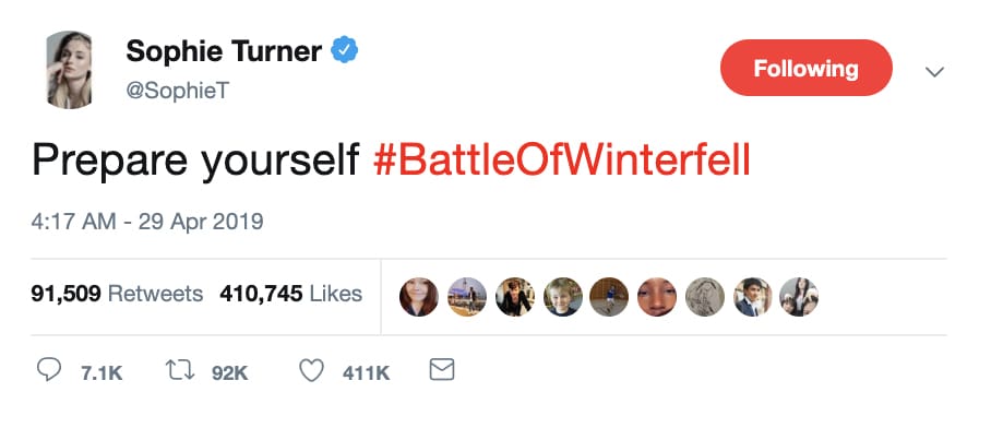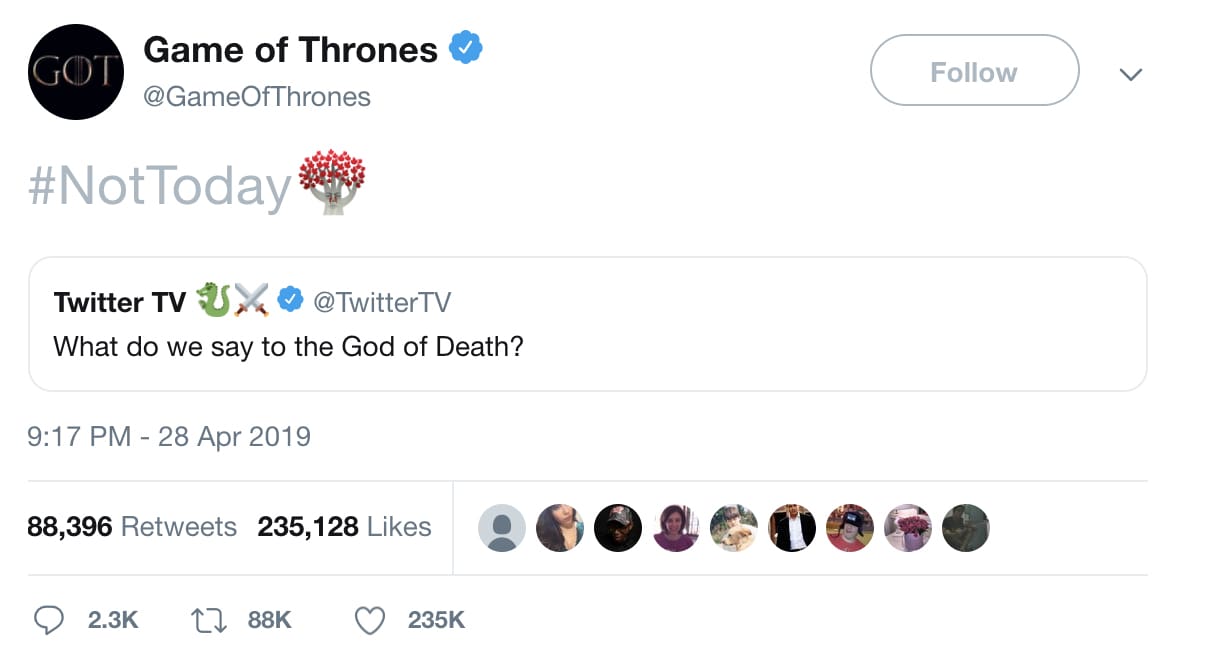 แฟนๆ ของ GoT ต่างพากันเข้าทวิตเตอร์เพื่อแลกเปลี่ยนความคิดเห็นที่มีต่อซีซั่นล่าสุด พูดคุยถึงไฮไลท์และทฤษฎีต่างๆตลอดจนโต้เถียงกันว่าใครคือ “ไนท์คิง” และตามติด #BattleOfWinterFell จนกระทั่งล่าสุด จุดสนใจมากที่สุดอยู่ที่ #AryaStark และความเป็นฮีโร่ของเธอ [นี่เป็นการสปอยล์!] ผู้ที่โค่น #NightKing ลงได้