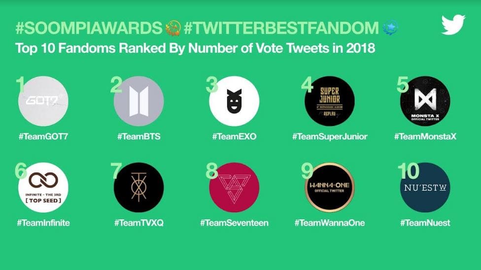 #TeamGOT7 เป็นผู้ชนะในสาขา #TwitterBestFandom ด้วยจำนวนการโหวตราว 40 เปอร์เซ็นต์ ของการทวิตโหวตทั้งหมด ทำให้พวกเขารักษาตำแหน่งผู้ชนะในฐานะBest Fandom ไว้ได้เป็นปีที่สาม และตอกย้ำสถานะ GOT7 ในฐานะศิลปินที่มีอิทธิพลสูงท่ามกลางกระแสฮิตของวัฒนธรรมเกาหลี หรือ Hallyu wave ได้อย่างสวยงาม นอกจากนี้ @GOT7Official ยังได้รับตำแหน่ง “Best Male Group” และรางวัล “Latin America Popularity Award” จากเวที Soompi Awards ในปีนี้อีกด้วย