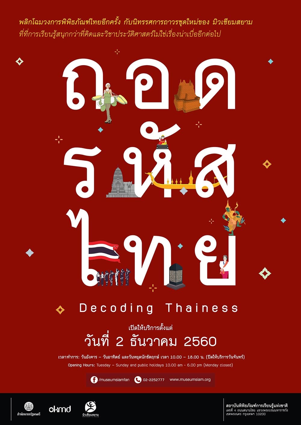 ทั้งนี้ ผู้สนใจสามารถเข้าชม นิทรรศการชุด “ถอดรหัสไทย” ได้ตั้งแต่วันเสาร์ที่ 2 ธันวาคม 2560 เป็นต้นไป ทุกวันอังคาร – วันอาทิตย์ (ปิดวันจันทร์) เวลา 10.00 – 18.00 น. ณ มิวเซียมสยาม ท่าเตียน(ข้างวัดโพธิ์) กรุงเทพฯ สอบถามรายละเอียดเพิ่มเติมที่หมายเลขโทรศัพท์ 02-225-2777 หรือ www.facebook.com/museumsiamfan