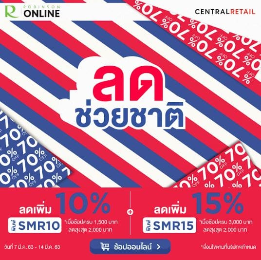 ช้อปออนไลน์ รับส่วนลดสูงสุด 70% พร้อม แจกโค้ดส่วนลดสูงสุด 2,000 บาท หรือ สูงสุดถึง 15% และ ส่งฟรี! ทุกคำสั่งซื้อทั่วประเทศ ตั้งแต่วันที่ 7 – 14 มีนาคม 2563 ที่ ROBINSON ONLINE หรือสะดวกมากขึ้นด้วยบริการสั่