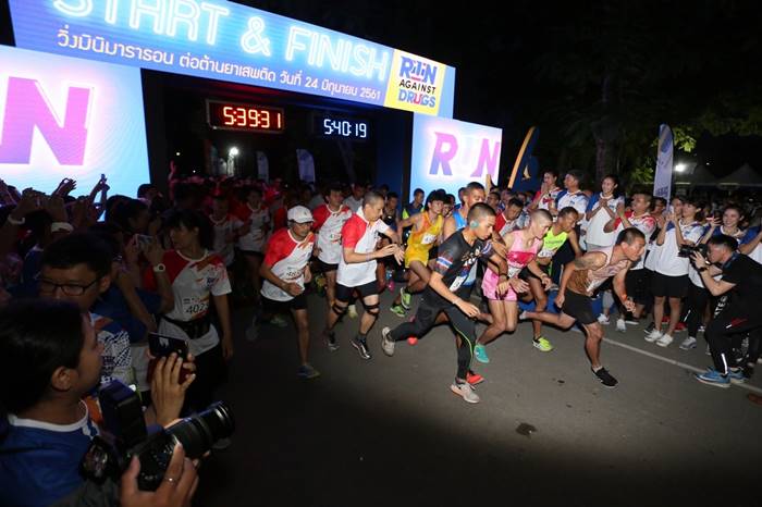 ผ่านไปแล้วด้วยความคึกคักกับกิจกรรม “วิ่งมินิมาราธอน ต่อต้านยาเสพติด” (RUN AGAINST DRUGS) ในวันอาทิตย์ที่ 24 มิถุนายน ที่ผ่านมา ณ สวนวชิรเบญจทัศ (สวนรถไฟ)และสวนสมเด็จพระนางเจ้าสิริกิติ์ฯ เนื่องในวันต่อต้านยาเสพติดโลก (วันที่ 26 มิถุนายน ของทุกปี) จัดโดยสำนักงาน ป.ป.ส. กระทรวงยุติธรรม ภายใต้แนวคิดและคำขวัญ “ไทยนิยมยั่งยืน ร่วมแก้ไขปัญหายาเสพติด 26 มิถุนายน วันต่อต้านยาเสพติดโลก” เพื่อให้ประชาชนได้มีส่วนร่วมในกิจกรรมเนื่องในวันต่อต้านยาเสพติดโลก แสดงสัญลักษณ์ในการต่อต้านยาเสพติด เกิดการรณรงค์สร้างกระแสให้ประชาชนสนใจในการออกกำลังกาย เพื่อสร้างสุขภาพอนามัยที่ดีและห่างไกลยาเสพติด ซึ่งงานนี้ได้รับความร่วมมือจากทุกภาคส่วน ซึ่งได้รับเกียรติจาก พลอากาศเอก ประจิน จั่นตอง รองนายกรัฐมนตรี และรัฐมนตรีว่าการกระทรวงยุติธรรม มาเป็นประธานในงาน พร้อมด้วย นายศิรินทร์ยา สิทธิชัย เลขาธิการ ป.ป.ส. รวมถึงคณะทำงาน ผู้บริหาร และเจ้าหน้าที่จาก ป.ป.ส. มากมาย อีกทั้งยังได้รับความร่วมมือจากหน่วยงานภาคเอกชน ที่มาร่วมเป็นผู้สนับสนุนการจัดงาน และซุ้มอาหารและเครื่องดื่มต่างๆ คอยให้บริการประชาชนที่เข้าร่วมกิจกรรม