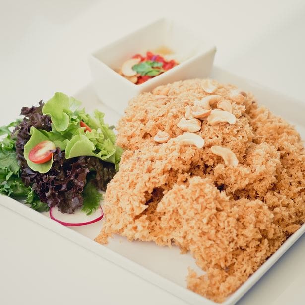 ยำแซลมอนฟู ตัดรสชาติความเผ็ดด้วยรสชาติกรุบกรอบของแซลมอนทอดกับน้ำยำสามรส