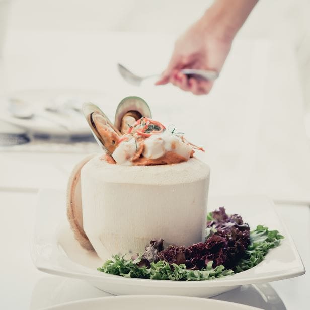 ห่อหมกมะพร้าวอ่อน เมนูนี้รสชาติเข้มข้นเลยทีเดียว แต่อาจจะเผ็ดน้อยไปนิด ถ้าชอบรสชาติจัดจ้านแต่ไม่เผ็ดมาก อันนี้เหมาะ!!