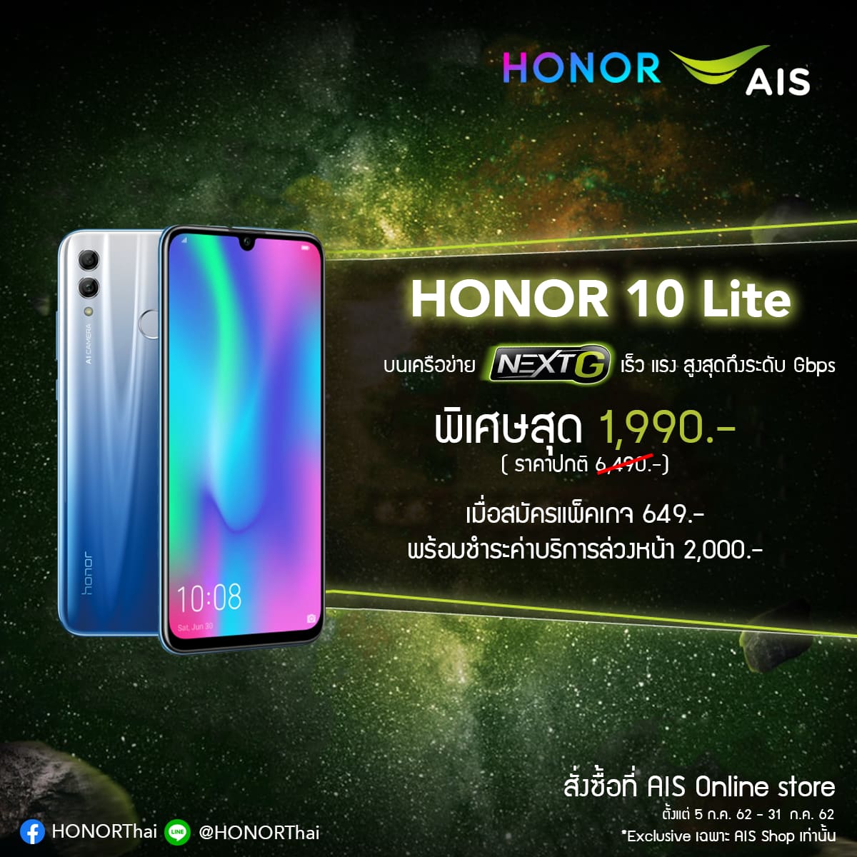 • HONOR 10 Lite ราคาปกติ 6,490 บาท ลดเหลือ 3,490 บาท เมื่อสมัครแพ็กเกจเริ่มต้นที่ 449 บาท พร้อมชำระค่าบริการล่วงหน้า 1,000 บาท และพิเศษ ลดเหลือเพียง 2,490 บาท เมื่อสมัครแพ็กเกจเริ่มต้นที่ 649 บาท พร้อมชำระค่าบริการล่วงหน้าจำนวน 2,000 บาท