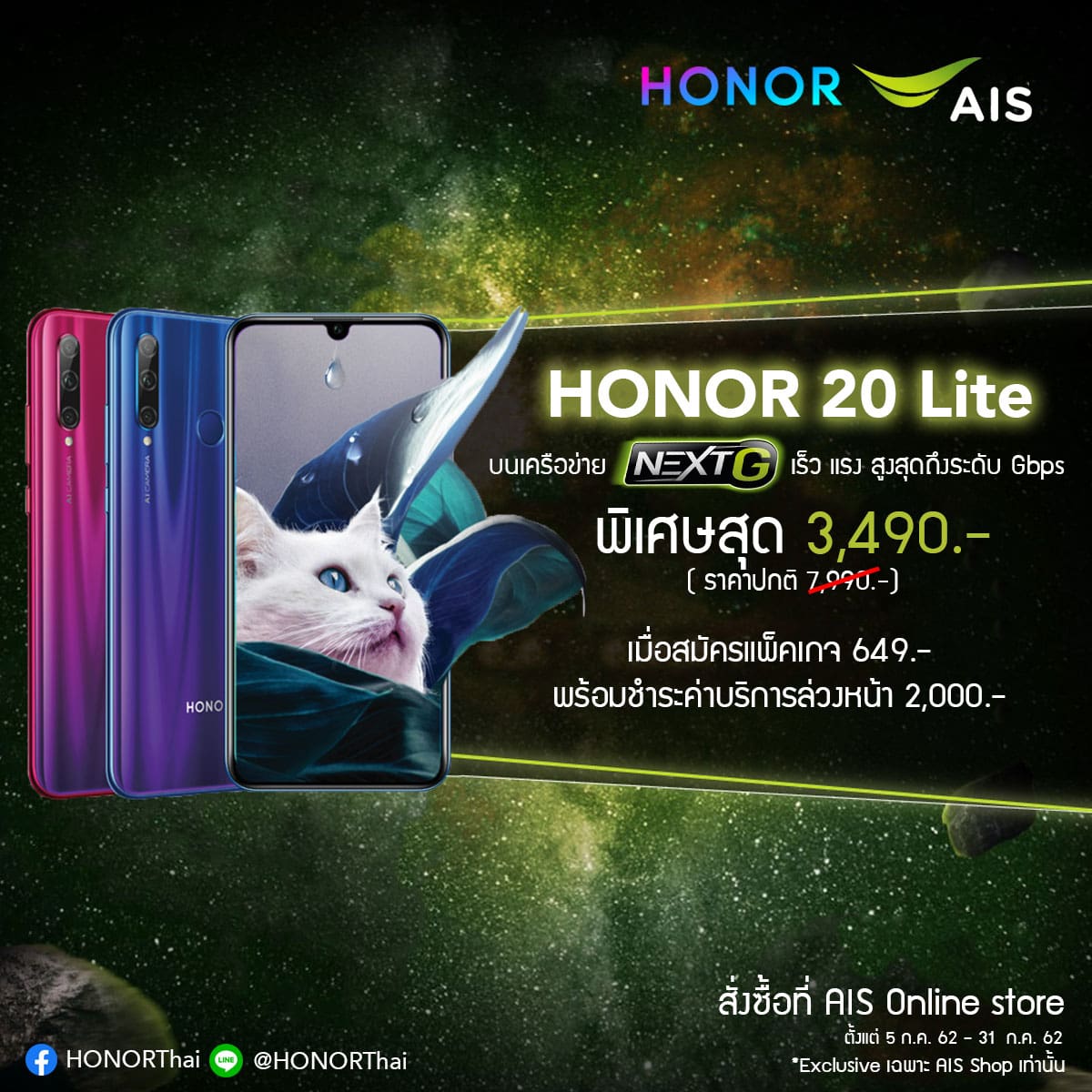 • HONOR 20 Lite ราคาปกติ 7,990 บาท ลดเหลือ 4,990 บาท เมื่อสมัครแพ็กเกจเริ่มต้นที่ 449 บาท พร้อมชำระค่าบริการล่วงหน้า 1,000 บาท และพิเศษ ลดเหลือเพียง 3,490 บาท เมื่อสมัครแพ็กเกจเริ่มต้นที่ 649 บาท พร้อมชำระค่าบริการล่วงหน้าจำนวน 2,000 บาท