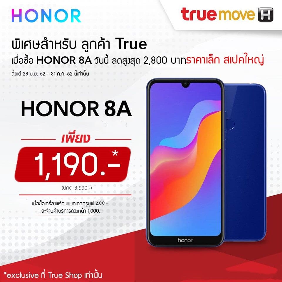 • HONOR 8A ราคาปกติ 3,990 บาท ลดเหลือ 1,190 บาท เมื่อสมัครแพ็กเกจเริ่มต้นที่ 499 บาท พร้อมชำระค่าบริการล่วงหน้า 1,000 บาท