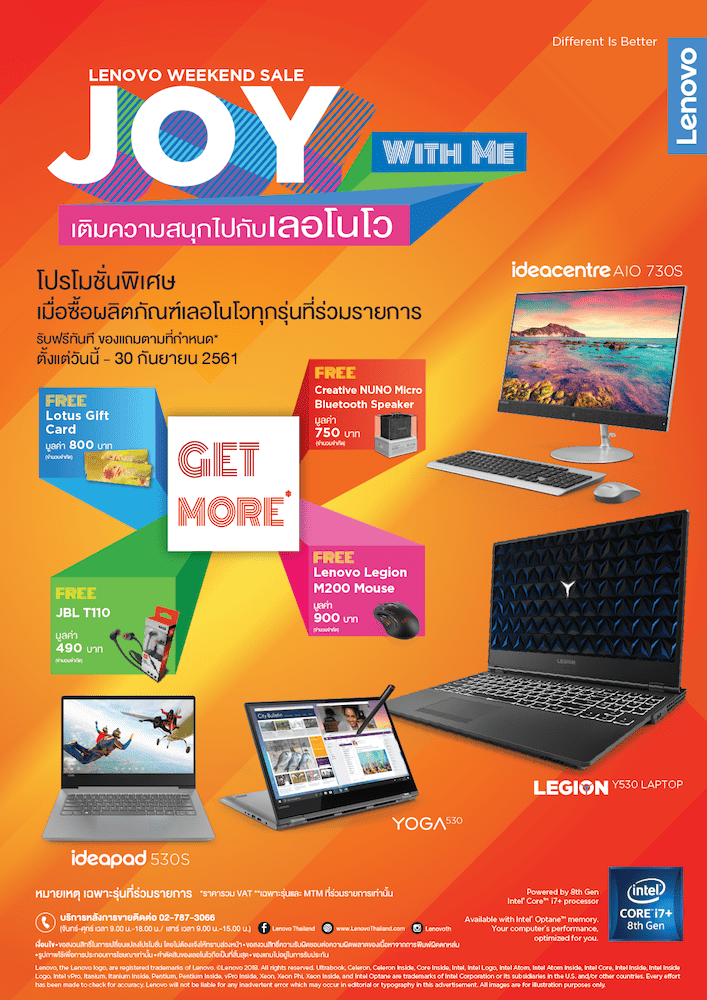 เลอโนโว ผู้นำยอดขายคอมพิวเตอร์อันดับ 1 จัดกิจกรรมมอบความสุขเติมความสนุกสนานให้กับลูกค้า โดยยกขบวนผลิตภัณฑ์โน๊ตบุ๊ค พีซี แท็บเล็ต และคอมพิวเตอร์มาจัดโปรโมชั่นพิเศษ พร้อมของแถมสุดคุ้มมากมาย อาทิ Lotus Gift Card, ลำโพงบลูทูธ, เม้าส์ไร้สาย Lenovo Legion M200 Mouse และ หูฟัง JBL T110 รวมทั้งของแถมน่าสนใจอื่นๆอีกเพียบ เมื่อซื้อผลิตภัณฑ์เลอโนโวรุ่นที่ร่วมรายการ ตั้งแต่วันนี้ – 30 กันยายน 2561