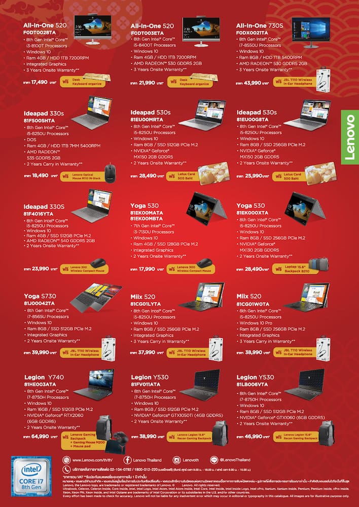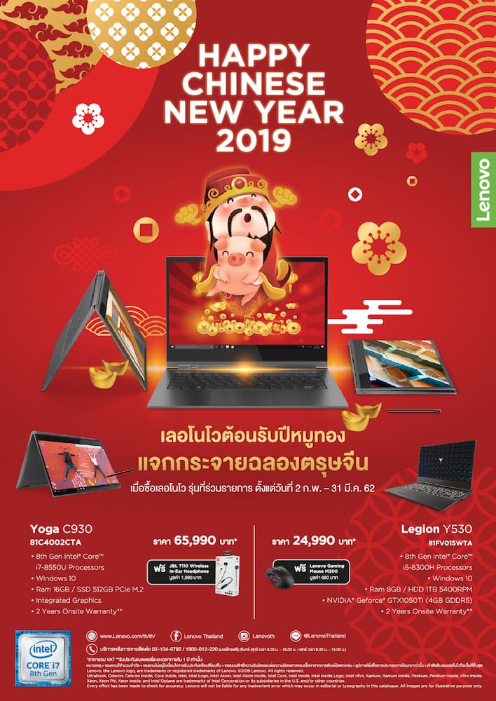 เลอโนโว ผู้นำยอดขายคอมพิวเตอร์อันดับ 1 จัดแคมเปญ ‘Happy Chinese New Year 2019’ นำสินค้าสินค้ากลุ่มคอนซูเมอร์ทั้ง Lenovo All-In-One, Lenovo IdeaPad, Lenovo Yoga, Lenovo Miix, และ Lenovo Legion มาเอาใจคอคอมพิวเตอร์ตั้งโต๊ะและโน๊ตบุ๊ค พร้อมคืนกำไรให้ลูกค้าทุกท่าน ด้วยการมอบของสมนาคุณมากมายอย่าง ออร์กาไนเซอร์สำหรับจัดเก็บสิ่งของบนโต๊ะเดสก์ท็อป, หูฟังไร้สาย JBL แบบ In-Ear, Lenovo ออฟติคอลเม้าส์, บัตรของขวัญจาก Lotus, เมาส์ไร้สาย Lenovo, และกระเป๋าเป้ขนาด 15.6 นิ้ว เมื่อลูกค้าซื้อผลิตภัณฑ์โน๊ตบุ๊คและคอมพิวเตอร์ของเลอโนโวที่ร่วมรายการ ตั้งแต่วันนี้ ถึง วันที่ 31 มีนาคม 2562