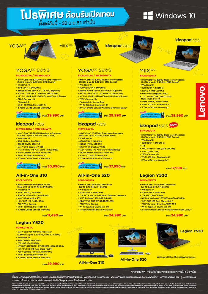 - เมื่อซื้อ Lenovo Yoga 520 โน๊ตบุ๊ค 2-in-1 ครบทั้งแท็บเล็ตและพีซี ใช้งานได้ยืดหยุ่นครอบคลุมถึง 360 องศา ไม่ว่าจะใช้ทำงานหรือความบันเทิง ให้คุณปรับเปลี่ยนการใช้งานได้อย่างอิสระ 4 รูปแบบ พร้อมขุมพลัง Intel® Core i5 ในราคาเพียง 29,990 บาท รับฟรีทันที! JBL Bluetooth Headset มูลค่า 2,490 บาท