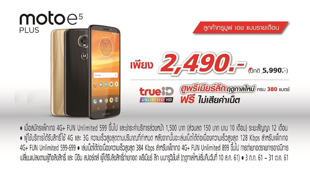 สำหรับลูกค้าที่สนใจ moto e5 plus มาพร้อมสี Fine Gold สุดหรู และ สี Black สุดคลาสสิก ในสุดคุ้มเพียง 5,990 บาท พิเศษสุดสำหรับลูกค้า Truemove H แบบรายเดือน! สามารถเป็นเจ้าของ moto e5 plus ได้ในราคาเพียง 2,490 บาท เมื่อสมัครแพ็คเกจ 4G+ Fun Unlimited 599 บาทขึ้นไป และชำระค่าบริการล่วงหน้า 1,500 บาท