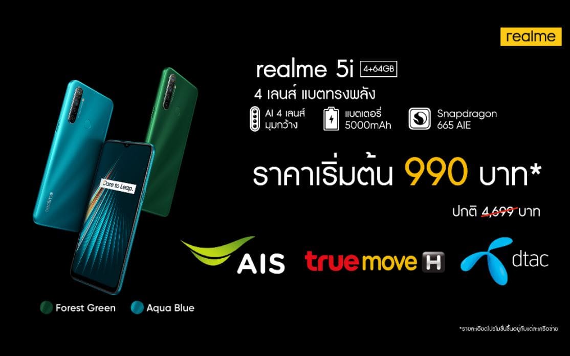พิเศษ! สำหรับลูกค้า AIS, TrueMove H และ DTAC สามารถเป็นเจ้าของ realme 5i ความจุ 4+64 GB ในราคาเริ่มต้นเพียง 990 บาท