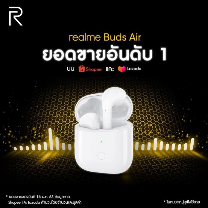 นอกจากนี้ realme ยังเปิดตัวไอเท็มสุดพิเศษ realme Buds Air หูฟังไร้สายที่มาพร้อมสโลแกน ตัวจริงการเชื่อมต่อแบบไร้สาย ที่จะช่วยสร้างอรรถรสเสียงของคุณให้มีคุณภาพและยกระดับการใช้ชีวิตของคุณให้ง่ายมากขึ้น การันตีความแรงโดยรางวัลยอดขายอันดับ 1 จาก Flash Sale ใน Shopee และ Lazada วางจำหน่ายแล้ววันนี้ ในราคาเพียง 1,999 บาท ที่ realme Brand Shop ช่องทางออนไลน์ที่ Lazada และ Shopee