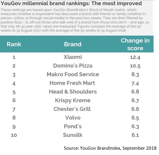 YouGov BrandIndex ได้ทำการคัดเลือก 450 แบรนด์ในรอบแรกที่ได้รับการกล่าวถึงในเชิงบวก และสอบถามความคิดเห็นถึงการรับรู้ในเชิงบวกของแต่ละแบรนด์ในช่วงสองอาทิตย์ที่ผ่านมา ไม่ว่าจะผ่านทางช่องทางการโฆษณาสินค้า ข่าวสาร หรือการบอกเล่าปากต่อปาก แบรนด์ที่มีการรับรู้ต่ำกว่าเกณฑ์จะถูกคัดออก และทำการสำรวจต่อไปว่าแบรนด์ใดที่ผู้ตอบแบบสำรวจ ได้พูดคุยกับเพื่อนหรือสมาชิกในครอบครัว (ไม่ว่าเป็นการพูดคุยผ่านการสนทนาตรง ผ่านระบบออนไลน์ หรือผ่านโซเซียลมีเดีย) ในช่วงสองอาทิตย์ที่ผ่านมา จากผลการสำรวจ แบรนด์ต่างๆ จะได้รับการจัดลำดับจากคะแนนการบอกเล่าปากต่อปาก โดยกลุ่มผู้ทำการสำรวจอยู่ในกลุ่มอายุระหว่าง 18 ปี ถึง 34 ปี โดยได้ทำการสำรวจระหว่างวันที่ 1 กันยายน พ.ศ. 2559 ถึง วันที่ 31 สิงหาคม พ.ศ. 2561