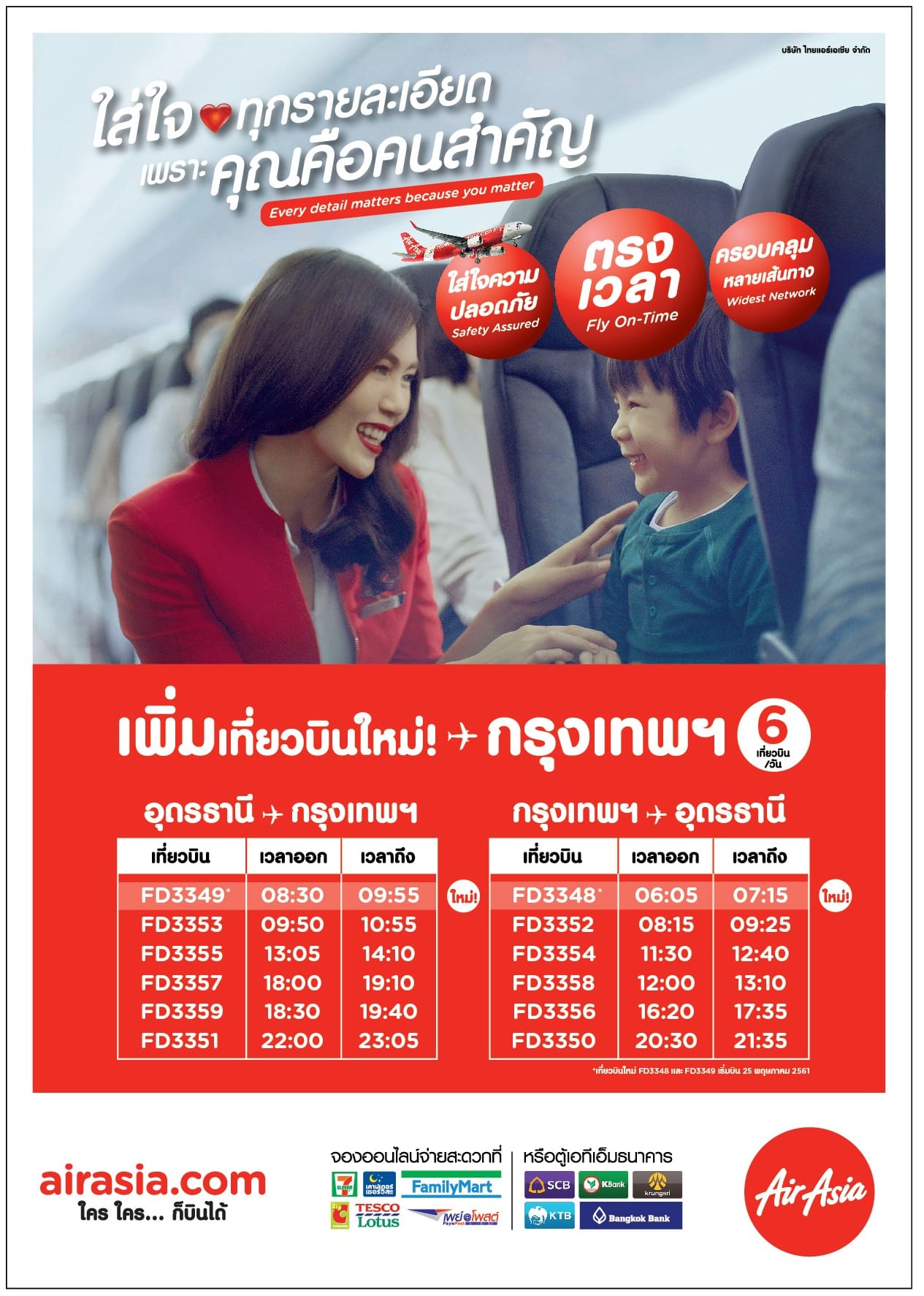 สายการบินไทยแอร์เอเชีย เพิ่มความถี่เที่ยวบินภายในประเทศ ตอบรับความต้องการบินที่เติบโตอย่างต่อเนื่อง โดยเพิ่มความถี่ในเที่ยวบินกรุงเทพฯ-อุดรธานี เป็น 6 เที่ยวบินต่อวัน และเส้นทางบินกรุงเทพฯ-พิษณุโลก เป็น 3 เที่ยวบินต่อวัน พร้อมเปิดขายเที่ยวบินใหม่ที่เพิ่มขึ้นตั้งแต่วันนี้เป็นต้นไป และเริ่มให้บริการบินในวันที่ 25 พฤษภาคม 2561