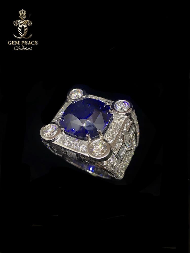 คอลเลคชั่นแรก แหวนไพลินซีลอน สี royal blue ขนาด 30 กะรัต ประดับเพชรบนตัวเรือน ที่ได้รับการออกแบบพิเศษ ให้มีลักษณะแข็งแกร่งแต่ก็ยังมีความพลิ้วไหวของลวดลายด้านข้าง