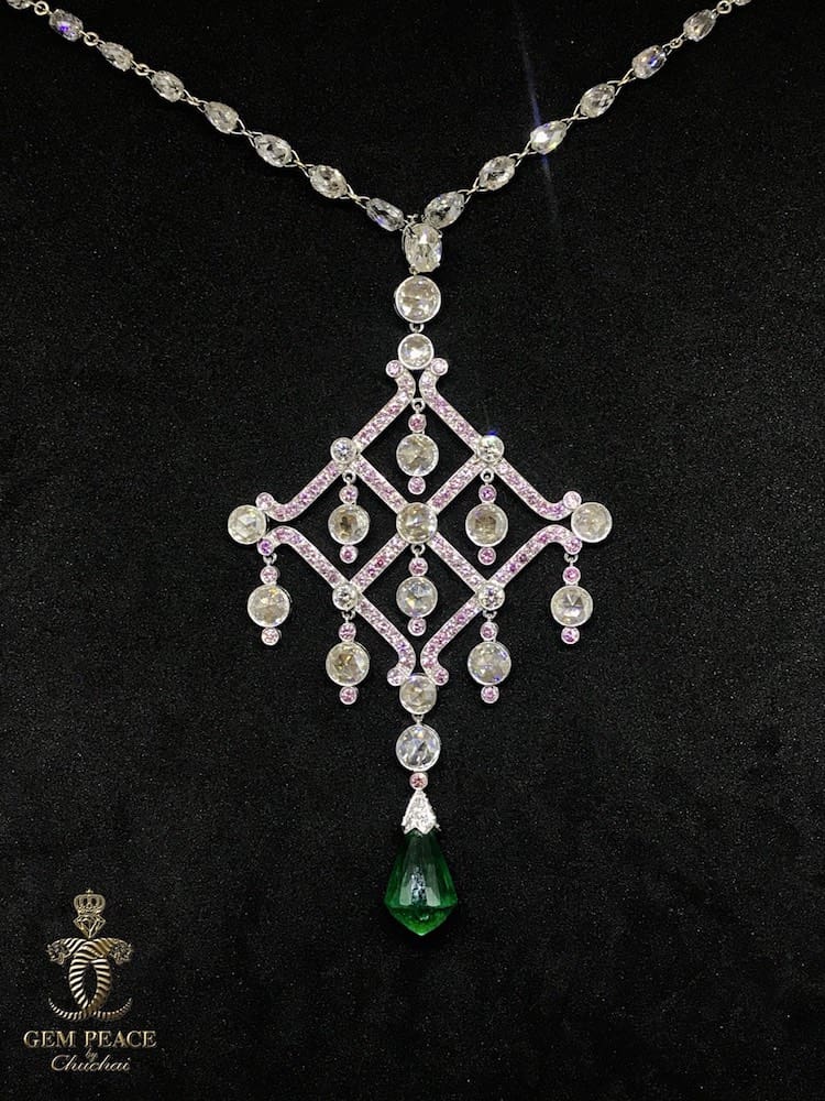 คอลเลคชั่นที่ 4 สร้อยคอเพชรพร้อมจี้เพชร ดีไซน์แปลกแหวกแนว ไม่ซ้ำแบบใคร โดยการใช้เพชรเจียรไนยเป็นทรง briolette และเดินเส้นสายตัวเรือนด้วยเพชรสีชมพู pink diamond ซึ่งหายากมากๆ พร้อมทั้งมีการเลือกใช้มรกตสั่งเจียระไนทรงพิเศษเช่นเดียวกัน ประดับไว้บริเวณปลายสุดของชิ้นงาน