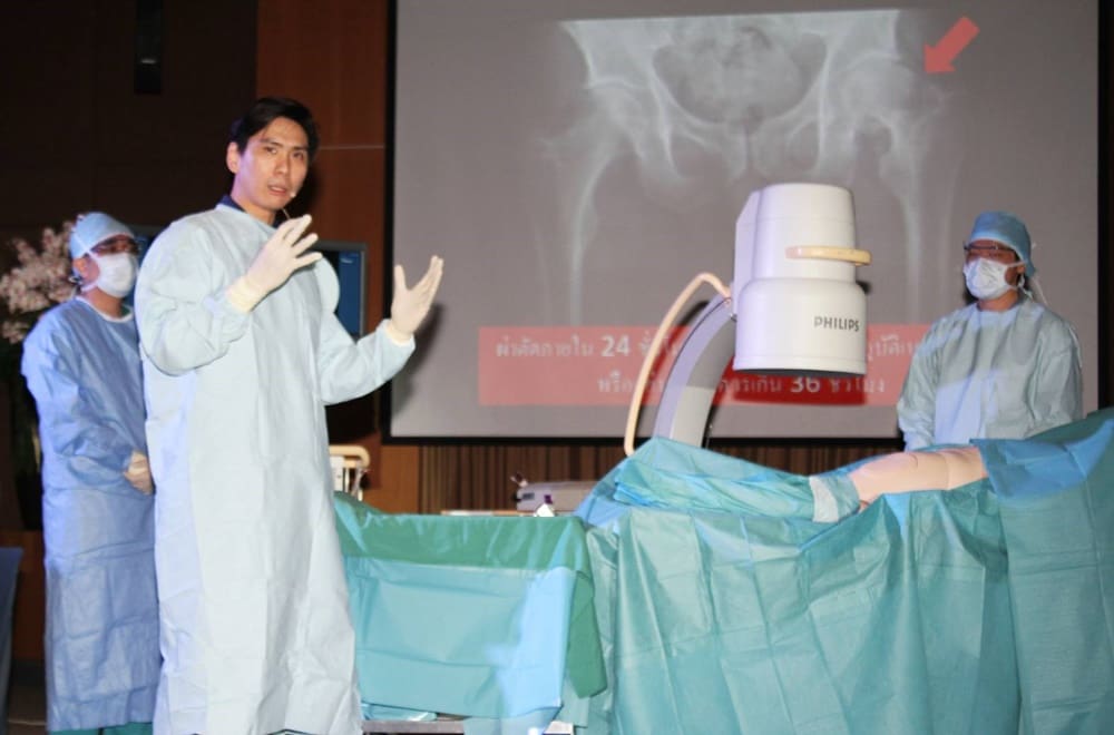 ดังนั้น การรักษาผู้ป่วยสูงอายุที่กระดูกหักจากการพลัดตกหรือหกล้มนั้นจะให้ความสำคัญกับกระดูกสะโพกเป็นหลัก ผู้ป่วยควรได้รับการรักษาหรือผ่าตัดภายใน 24 – 48 ชม. ด้วยระบบการรักษาแบบ Co-management โดยให้ผู้เชี่ยวชาญสหสาขาวิชาชีพ (Multidisciplinary team) ร่วมดูแล ประกอบไปด้วย แพทย์ศัลยกรรม แพทย์ศัลยกรรมออโธปิดิกส์ อายุรแพทย์ผู้สูงอายุ วิสัญญีแพทย์ แพทย์เวชศาสตร์ฟื้นฟู นักกายภาพบำบัด เภสัชกรคลินิก นักโภชนากร และพยาบาล จะเข้าร่วมประเมินผู้ป่วยตั้งแต่แรกรับในทุกๆด้านอย่างเป็นองค์รวม เพื่อร่วมวางแผนการรักษาร่วมกับผู้ป่วยและครอบครัว เพื่อช่วยให้ผู้ป่วยกลับมาเดินได้ในสภาพเดิมในเวลาอันสั้น แพทย์จะใช้การผ่าตัดกระดูกสะโพกหักแบบแผลเล็ก โดยเทคนิคการรักษากระดูกหักแบบรถไฟใต้ดิน (Minimally Invasive Osteosynthesis, MIPO) เป็นการผ่าตัดตรึงกระดูกแบบแผลเล็ก ใช้อุปกรณ์เฉพาะในการทำทาง เพื่อสอดโลหะแกน หรือโลหะแผ่นใต้ชั้นกล้ามเนื้อผ่านตำแหน่งที่หัก โดยวางเหล็กแผ่นอยู่เหนือผิวกระดูก จากนั้นจึงเปิดแผลเล็กๆ เพื่อยึดกระดูกด้วยสกรูด้านบนและด้านล่างของตำแหน่งที่หัก โดยพยายามทำให้เกิดการบาดเจ็บของเนื้อเยื่อให้น้อยที่สุด ซึ่งแพทย์จะใช้เครื่องเอ็กซเรย์ฟรูโอโรสโคปช่วยในการจัดแนวกระดูกและวางตำแหน่งของโลหะ ข้อดีคือ ช่วยให้ผู้ป่วยมีอาการปวดน้อยลง ลดความเสี่ยงต่อการติดเชื้อบริเวณแผลผ่าตัด และลดการเสียเลือด ผู้ป่วยฟื้นตัวได้เร็ว กระดูกติดเร็ว และแผลมีขนาดเล็กสวยงาม นอกจากนี้ ยังมีเทคนิคการผ่าตัดเปลี่ยนข้อสะโพกแนวใหม่ แบบไม่ตัดกล้ามเนื้อ” โดยผ่าตัดเข้าจากด้านหน้าข้อสะโพกแนวใหม่ แบบไม่ตัดกล้ามเนื้อ (Direct Anterior Approach: DAA) เป็นการผ่าตัดทางด้านหน้า ระหว่างการผ่าตัดแพทย์จะใช้เครื่องฟลูออโรสโคป C-ARM ช่วยเพิ่มความแม่นยำในการใส่ข้อสะโพกเทียม และประเมินความสั้นยาวของสะโพก จึงหมดห่วงว่าหลังผ่าตัดแล้วขาทั้งสองข้างสั้นยาวไม่เท่ากัน โดยแผลยังมีความยาวประมาณ 3-4 นิ้ว และตื้นมาก สำหรับสุภาพสตรียังสามารถซ่อนแผลใต้ขอบบิกินี่ (Bikini incision) ได้อีกด้วย คนไข้จะสูญเสียเลือดน้อย ฟื้นตัวได้เร็ว อาการเจ็บปวดหลังผ่าตัดน้อย จึงสามารถเดินได้ตามปกติไม่ต้องกะเผลกเอียงตัว สามารถกลับไปใช้ชีวิตแบบเดิมได้โดยไม่ต้องห่วงหากต้องลงน้ำหนักที่ข้อสะโพก มีความเสี่ยงของการหลุดของข้อสะโพกเทียมต่ำ คือ 0-0.5% ภาวะแทรกซ้อนที่อาจเกิดได้ในผู้สูงอายุที่กระดูกสะโพกหัก คือ ภาวะลิ่มเลือดอุดตัน ซึ่งจะพบได้ประมาณ 7-30% ในผู้ป่วยที่มีกระดูกสะโพกหัก สามารถป้องกันโดยให้ผู้ป่วยมีการเคลื่อนไหวร่างกายและล