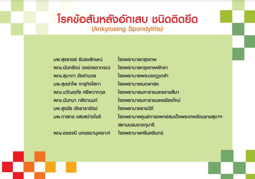 - ปวดหลังช่วงล่างและสะโพกร่วมกับอาการหลังตึงหรือรู้สึกยึดติดในบริเวณดังกล่าว เรื้อรังนานร่วมเดือนหรือเป็นปี อาจรู้สึกปวดหรือมีอาการข้อติดบริเวณอื่นร่วมด้วย เช่น หลัง ก้น ข้อต่อไหล่ ข้อต่อระหว่างฐานกระดูกสันหลังกับกระดูกเชิงกราน บางรายมีอาการตาอักเสบเป็นๆหายๆ อยู่บ่อยครั้ง สัญญาณเบื้องต้นของโรคข้อสันหลังอักเสบยึดติด (AS: Ankylosing Spondylitis) เกิดจากการระบบภูมิคุ้มกันของร่างกายมีความผิดปกติในการแยกแยะเนื้อเยื่อของร่างกายกับสิ่งแปลกปลอมอื่น เป็นโรคที่พบในคุณผู้ชายมากกว่าคุณผู้หญิงประมาณ 3 เท่า และเกิดในช่วงอายุระหว่าง 15-30 ปี โรคนี้มีอุบัติการณ์ต่ำ คนรู้จักโรคนี้ไม่มากนัก ทำให้ได้รับการรักษาล่าช้า