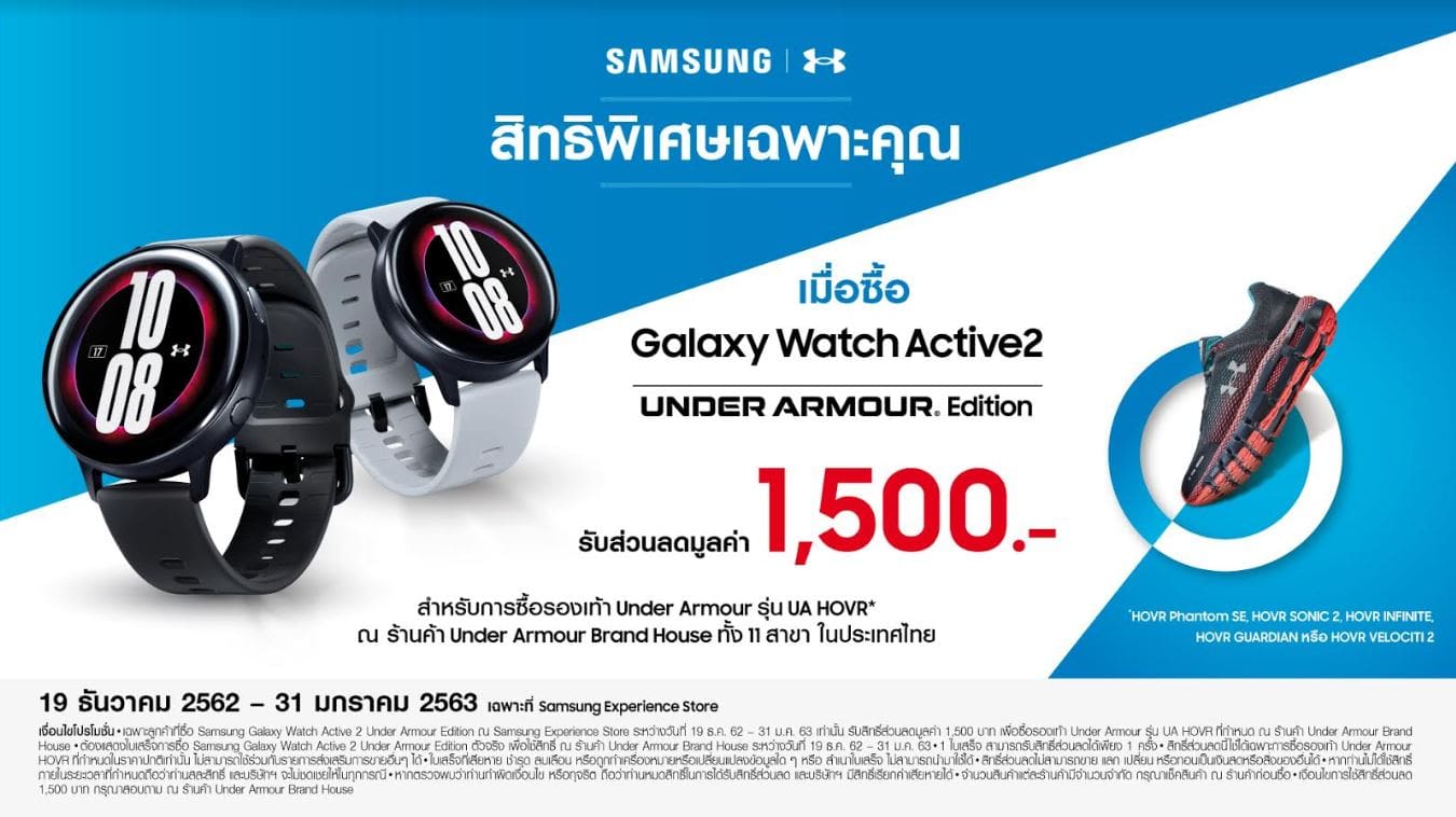 กรุงเทพฯ (20 ธันวาคม 2562) – ซัมซุง ร่วมกับ อันเดอร์ อาร์เมอร์ ส่งโปรโมชั่นสุดพิเศษเอาใจนักวิ่งและสายออกกำลังกาย เมื่อซื้อ Galaxy Watch Active2 Under Armour Edition ที่ ซัมซุง เอ๊กซ์พีเรียนซ์ สโตร์ ระหว่างวันที่ 19 ธันวาคม 2562 – 31 มกราคม 2563 รับส่วนลดมูลค่า 1,500 บาท สำหรับซื้อรองเท้า Under Armour HOVR Run Series (รุ่น HOVR PHANTOM SE, HOVR SONIC 2, HOVR INFINITE, HOVR GUARDIAN หรือ HOVR VELOCITI 2) ที่ อันเดอร์ อาร์เมอร์ แบรนด์เฮ้าส์ ทั้ง 11 สาขาในประเทศไทย เพียงแสดงใบเสร็จการซื้อตัวจริงเพื่อใช้สิทธิ์ภายในวันที่ 31 มกราคม 2563